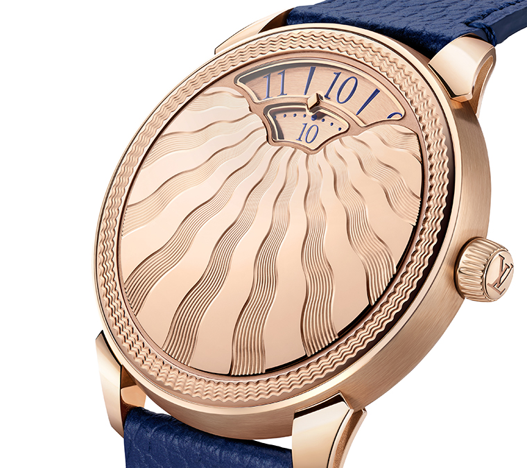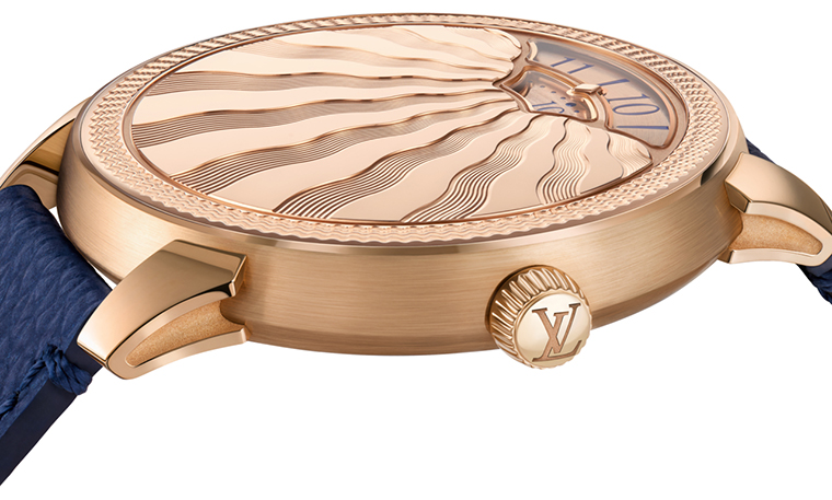 Tambour Convergence Guilloché ประดับด้วยลวดลาย guillochage แบบหมุนด้วยมือ ถึงสองรูปแบบ สานต่อความมุ่งมั่นของ Louis Vuitton ในการยกระดับความเชี่ยวชาญด้าน métiers d’art ในนาฬิกาที่พัฒนาและควบคุมได้ภายในเมซงอย่างแท้จริง รอบพื้นผิวด้านบนของตัวเรือนโรสโกลด์ ปรากฏวงคลื่นซ้อนศูนย์กลางที่แผ่กระเพื่อมเป็นรัศมี มอบมิติใหม่ด้านสัมผัสให้กับแผ่นโลหะมีค่า ขณะที่ใจกลางเรือนเวลาถูกขับเน้นด้วยลำแสงเป็นริ้วคลื่นซัดสาด แผ่ออกจากช่องแสดงชั่วโมงและนาที เพิ่มความลึกและพื้นผิวให้กับตัวเรือนที่โค้งนูนอย่างละเมียด