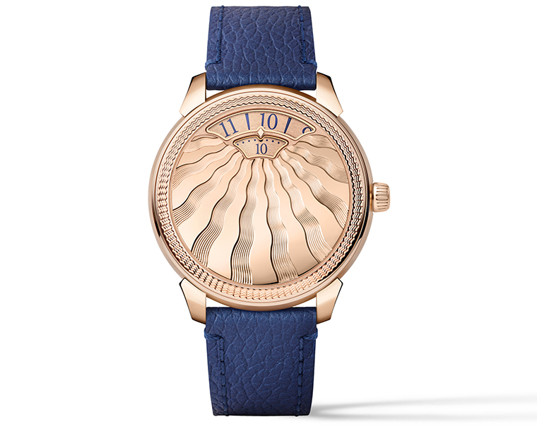 ลวดลายกีโยเช่บริเวณกึ่งกลางยังตอกย้ำหนึ่งในหลักการออกแบบดั้งเดิมที่เกี่ยวข้องกับรูปทรงของช่องแสดงชั่วโมงและนาที ซึ่งได้แรงบันดาลใจจากขอบเมฆสีทองที่ถูกแสงอาทิตย์ส่องทะลุ เมื่อผสานกับขอบช่องแสดงเวลาที่เคลือบโลหะ และการหักเหของแสงตามขอบคริสตัลแซฟไฟร์ เอฟเฟกต์นี้ยิ่งเด่นชัดขึ้น และลำแสงของลวดลายกีโยเช่ก็ทำหน้าที่เสมือนสัมผัสสุดท้ายที่ขยายพลังการสื่ออารมณ์ของรายละเอียดอันงดงามนี้ให้สมบูรณ์ยิ่งขึ้น