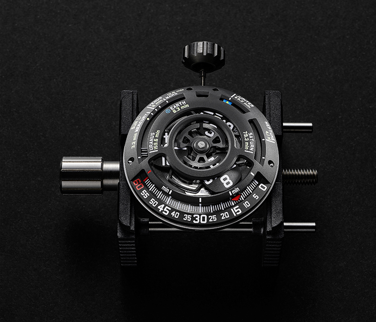 “การสวมผลงานชิ้นนี้เปรียบเสมือนการพกเศษเสี้ยวของจักรวาลไว้บนข้อมือ เป็นภาพจำลองของห้วงคอสมอสที่ถูกย่อส่วนให้สอดรับกับการรับรู้ของมนุษย์” Martin Frei ผู้อำนวยการฝ่ายศิลป์และผู้ร่วมก่อตั้ง URWERK อธิบาย “ด้วยการถ่ายทอดระยะทางทางดาราศาสตร์ลงสู่เรขาคณิตอันจำกัดของหน้าปัดนาฬิกา การแปรเปลี่ยนของมาตราส่วนนี้ทำให้ความเร็วอันมหาศาลของแสงกลับดูราวกับการเคลื่อนไหวที่แทบหยุดนิ่งต่อสายตา ความเร็วคงที่ทางกายภาพจึงถูกมองว่าช้าลง เพียงเพราะกรอบอ้างอิงและสัดส่วนได้เปลี่ยนไป ลำดับของปรากฏการณ์เผยตัวอย่างแม่นยำตามหลักวิทยาศาสตร์: แสงอาทิตย์ใช้เวลา 3.2 นาทีในการเดินทางถึงดาวพุธ 6 นาทีถึงดาวศุกร์ 8.3 นาทีถึงโลก 12.6 นาทีถึงดาวอังคาร 43.2 นาทีถึงดาวพฤหัสบดี 79.3 นาทีถึงดาวเสาร์ 159.6 นาทีถึงดาวยูเรนัส และ 4.1 ชั่วโมงจึงจะถึงดาวเนปจูน กลไกนี้จึงมิได้เป็นเพียงการแสดงข้อมูล หากยังมอบประสบการณ์ให้ผู้สวมใส่รับรู้ระยะห่างระดับจักรวาลได้อย่างเป็นรูปธรรม พร้อมย้ำเตือนอย่างสง่างามว่าจักรวาลนั้นกว้างใหญ่ไพศาลเพียงใด”