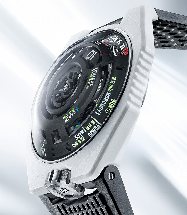 ความจริงทางวิทยาศาสตร์ข้อนี้คือหัวใจของ UR-100V LS Ceramic นอกเหนือจากการแสดงชั่วโมงและนาทีด้วยระบบดาวเทียม นาฬิกายังผสานการแสดงผลแบบสามมิติของดาวเคราะห์ทั้งแปดในระบบสุริยะ แต่ละตำแหน่งสอดคล้องกับเวลาที่แสงอาทิตย์ต้องใช้ในการเดินทางจากดวงอาทิตย์ไปยังดาวเคราะห์ดวงนั้นอย่างแม่นยำ เมื่อดาวเทียมชั่วโมงเคลื่อนพ้นจากแทร็กนาที บทบาทของมันก็แปรเปลี่ยนไป มันไม่ใช่เครื่องบอกเวลาในความหมายดั้งเดิมอีกต่อไป หากกลายเป็นหมุดหมายที่กำลังเคลื่อนที่ ขีดเส้นทางของโฟตอนข้ามผ่านระยะทางระดับจักรวาล