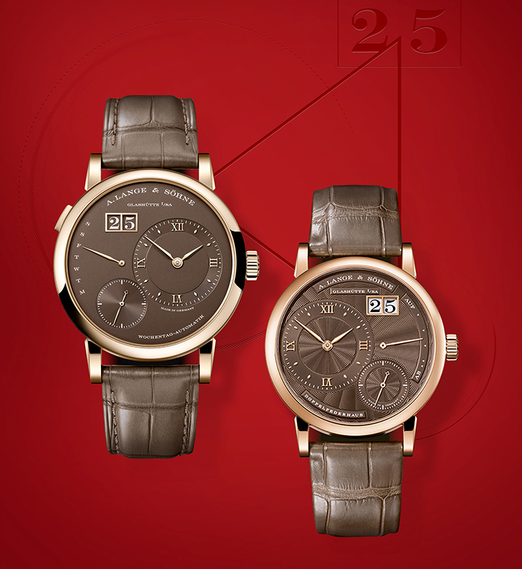 ใต้ภาพ: Lange 1 Daymatic ในตัวเรือนฮันนี่โกลด์ และ Little Lange 1 ในตัวเรือนพิงก์โกลด์