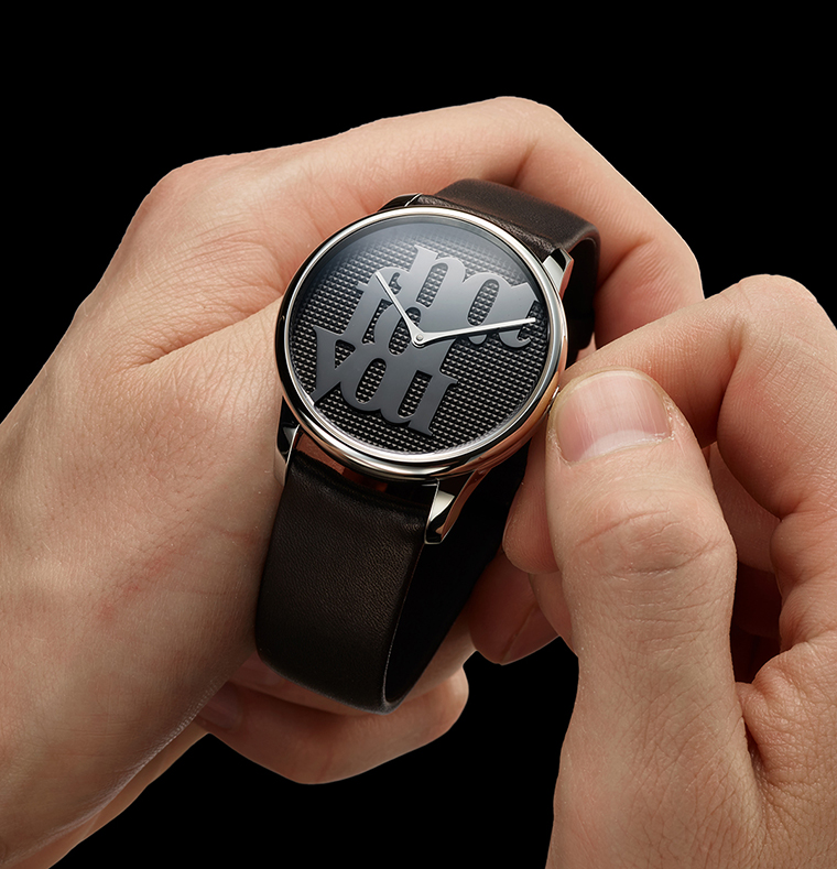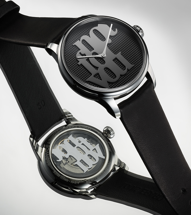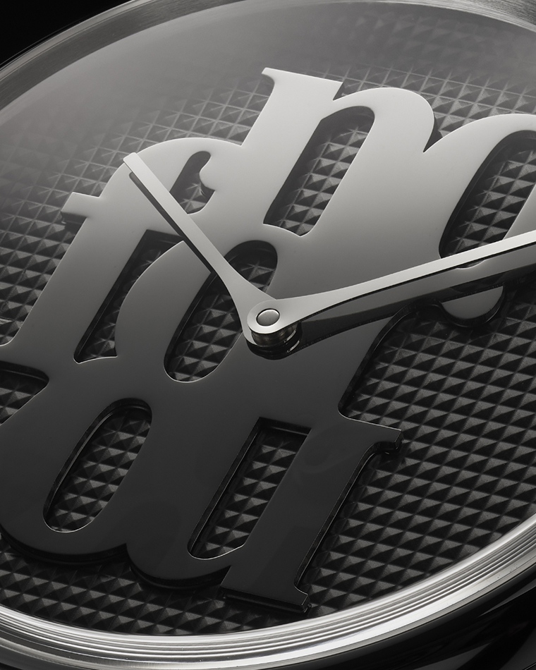 ตัวอักษรบนหน้าปัดโดดเด่นตัดกับลวดลาย Clou de Paris ขัดด้าน ช่วยเพิ่มทั้งพื้นผิวและมิติให้เห็นได้ชัด ลวดลายกีโยเช่ซึ่งเป็นหัวใจของการทำนาฬิกาแบบดั้งเดิม ยังสอดคล้องกับโลกทัศน์ของ Bonvicini ที่มักใช้ตะปู หนัง และโทนสีดำเป็นองค์ประกอบหลัก ขณะที่เข็มนาฬิกาชุบโรเดียมทรงเรียวเคลื่อนผ่านหน้าปัด ราวกับพาดผ่านงานประติมากรรม ช่วยเน้นแนวคิดและสารที่นาฬิกาต้องการสื่อได้อย่างชัดเจน