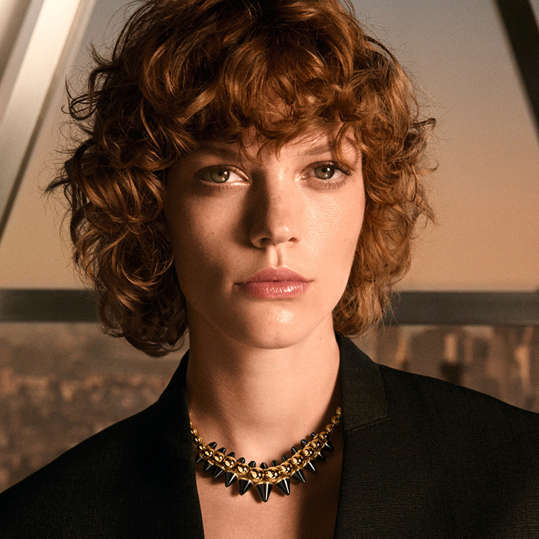ขนาดใหญ่พิเศษของ แคลช เดอ คาร์เทียร์ มาพร้อมกับสัดส่วนที่กว้างขึ้น หมุดออนิกซ์ได้รับการยกระดับขึ้น ช่วยเติมความหรูหราให้กับสร้อยข้อมือ สร้อยคอ และแหวนสามนิ้วที่ทำจากเยลโลว์โกลด์ให้มีความยืดหยุ่นในการสวมใส่อย่างเต็มที่