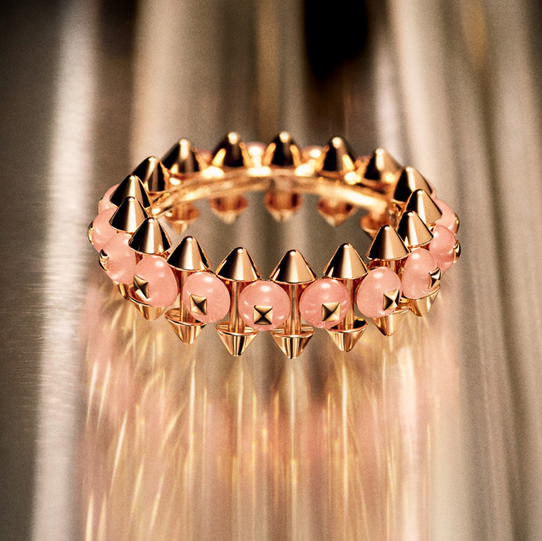 เฉดสีของอาเกทเคลือบสีแดงและสีเขียว แคลซีโดนีสีชมพู และออนิกซ์ ช่วยเติมเต็มความงดงามให้กับ แคลช เดอ คาร์เทียร์ บรรดาผลงานประดับลูกปัดอัญมณีที่จัดวางสลับกับหมุดทองคำสีชมพู ช่วยขับเน้นโครงสร้างและมิติเชิงสถาปัตยกรรมของแหวน จี้ และต่างหูในคอลเลคชั่นนี้