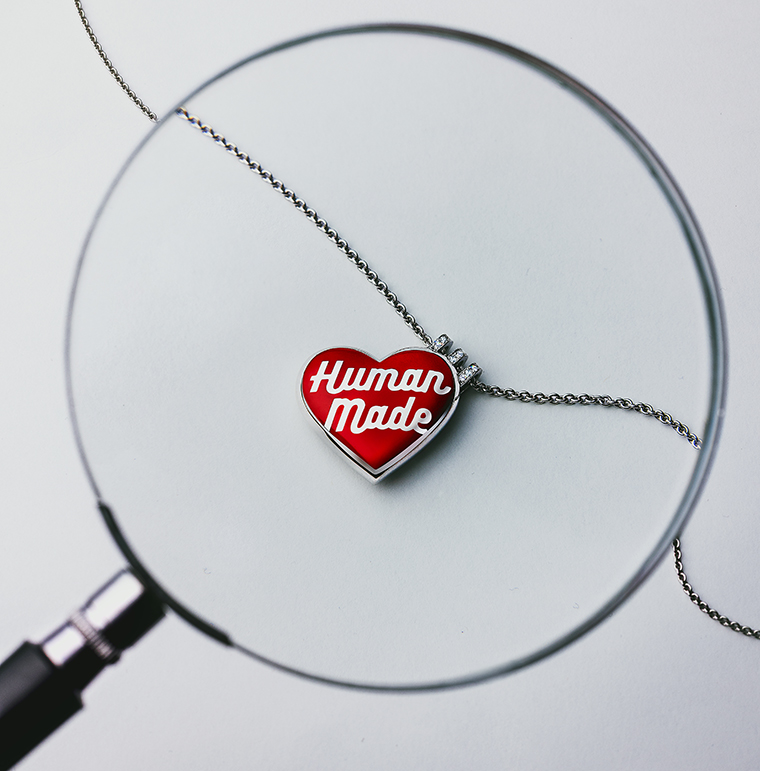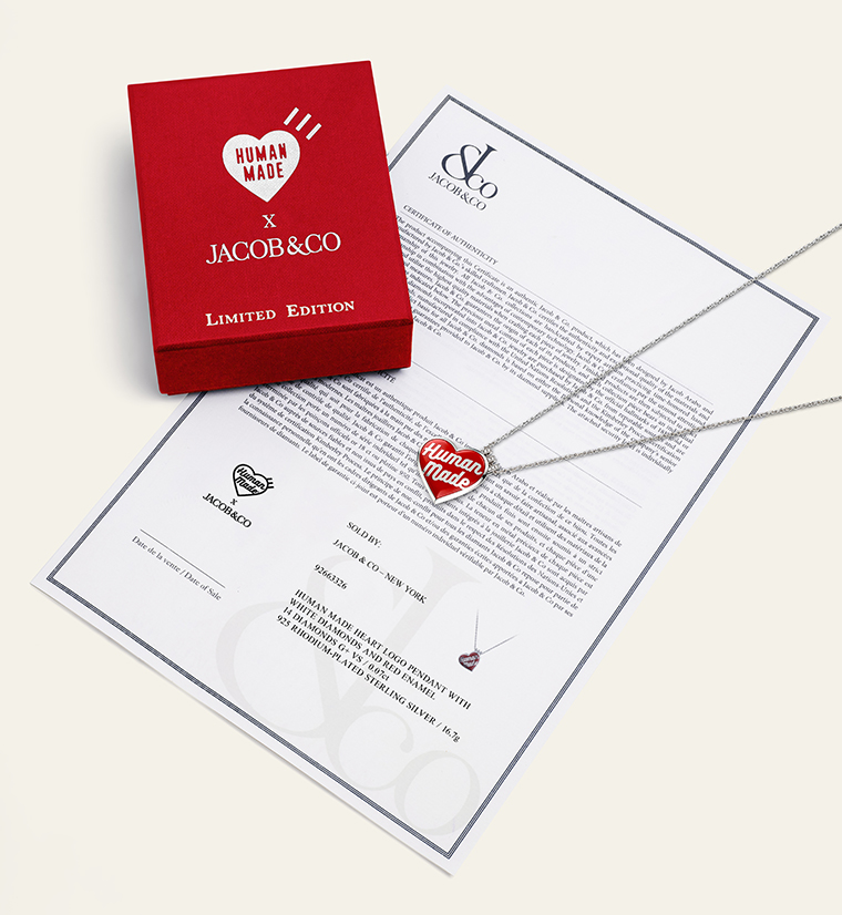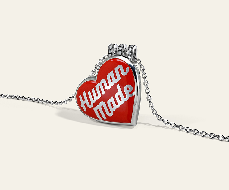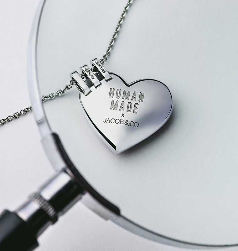 จี้รูปหัวใจ Jacob & Co. x HUMAN MADE X JOOPITER ถูกรังสรรค์ขึ้นในสไตล์อันเป็นเอกลักษณ์ของ Jacob & Co. โดยเปลี่ยนโลโก้รูปหัวใจอันเป็นสัญลักษณ์ของ HUMAN MADE ให้กลายเป็นของสะสมที่สวมใส่ได้และมีความประณีต โดดเด่น ด้วยทัศนคติที่มั่นใจ การตกแต่งที่แม่นยํา และสร้างสรรค์มาเพื่อให้สวมใส่ได้ในทุกๆ วัน