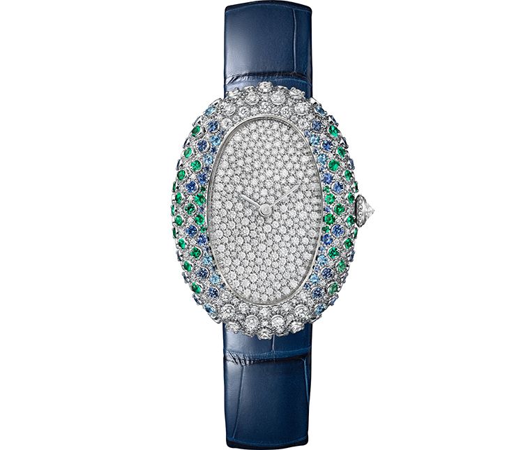คาร์เทียร์ผสานรูปทรงวงรีอันเป็นเอกลักษณ์ของเบญนัวร์เข้ากับเฉดสีซิกเนเจอร์ของเมซงอย่างสีน้ำเงินและสีเขียว เฉดสีที่หลุยส์ คาร์เทียร์ เรียกว่า “ลวดลายนกยูง” (peacock motif) ขอบตัวเรือนรังสรรค์ด้วยการประดับอัญมณีที่ซับซ้อน เพิ่มมิติและช่วยขับประกายความแวววาวของเพชร 170 เม็ด แซฟไฟร์ 58 เม็ด มรกต 54 เม็ด และอะความารีน 16 เม็ด บริเวณหน้าปัดประดับเพชรเจียระไนแบบบริลเลียนต์คัตเป็นสโนว์เซ็ตติ้ง (Snow-setting) จำนวนกว่า 262 เม็ด เปล่งประกายเล่นกับแสงไฟได้อย่างมีชีวิตชีวา ส่วนสายทำจากหนังจระเข้เคลือบเงาสีน้ำเงินพร้อมบัคเคิลแบบหมุดที่เสริมความหรูหราด้วยการประดับเพชรเจียระไนแบบบริลเลียนต์คัตอีก 21 เม็ด