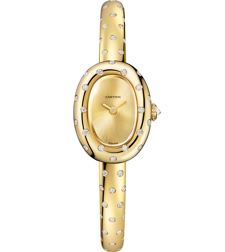 สำหรับรุ่นเยลโลว์โกลด์เรือนนี้ประดับด้วยเพชรเจียระไนแบบบริลเลียนท์คัตกว่า 70 เม็ด ด้วยความเชี่ยวชาญของช่างอัญมณีของคาร์เทียร์ พื้นผิวทองจึงเรียบเนียน ช่วยขับเน้นเส้นสายอันบริสุทธิ์และความโค้งมนได้อย่างงดงาม มาพร้อมหน้าปัดลวดลายซันเรย์สีทอง และเข็มทรงดาบเคลือบทอง โดยทั้งหมดนี้ยังคงเอกลักษณ์ของเบญนัวร์ไว้อย่างครบถ้วน ทั้งตัวล็อกแบบปุ่มกด กระจกแซฟไฟร์ทรงโดม และสายที่เรียบลื่นไร้รอยต่อซึ่งทอดยาวจากตัวเรือนไปสู่กำไลอย่างกลมกลืน