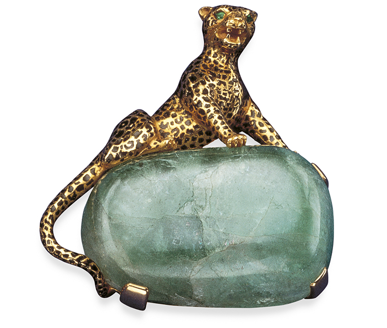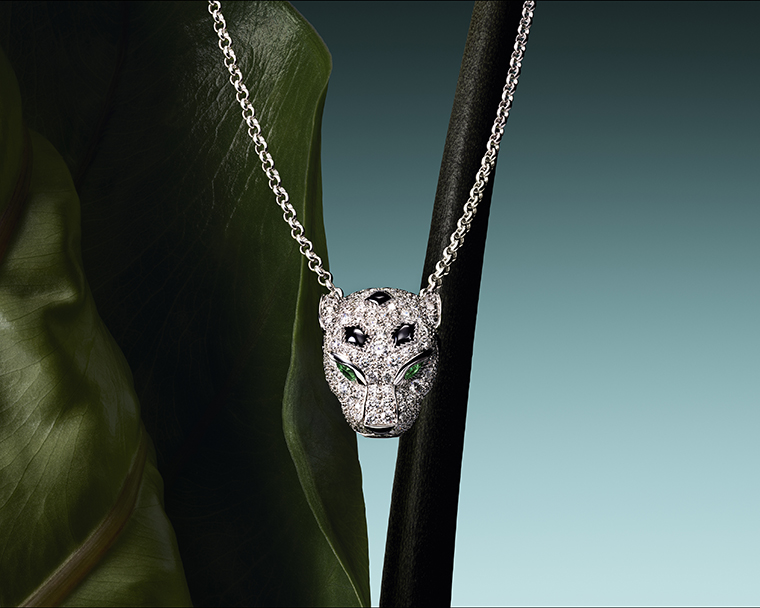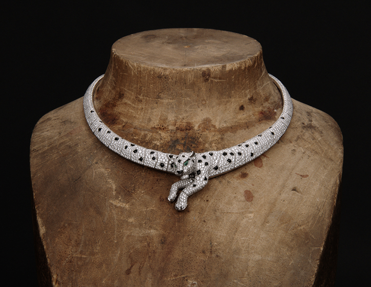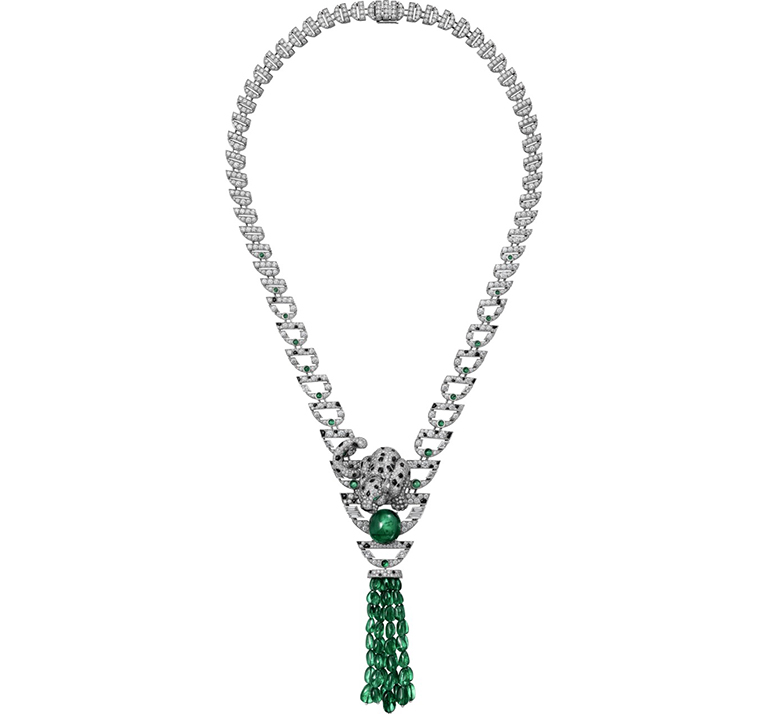 เสือแพนเตอร์มักสวมบทบาทเด่นในเครื่องประดับอัญมณีของคาร์เทียร์ ถือเป็นแรงบันดาลใจที่แท้จริงสำหรับการสร้างสรรค์ชิ้นงานอันโดดเด่นมากมาย อย่างสร้อยคอเส้นนี้ เสือแพนเตอร์กำลังปกป้องมรกตแซมเบียขนาด 15.28 กะรัต ขณะที่โดยรอบจัดเรียงด้วยองค์ประกอบกราฟิกแบบซ้ำๆ อย่างลายจุดออนิกซ์ของเส้นสายที่เชื่อมต่อกับมรกต ปิดท้ายด้วยพู่แขวนเสริมความมีชีวิตชีวาให้กับชิ้นงาน