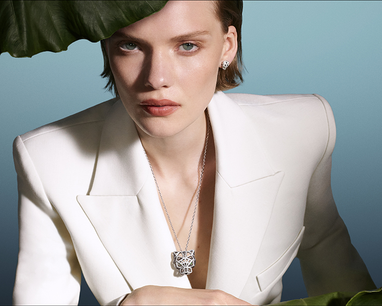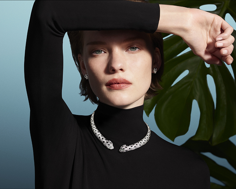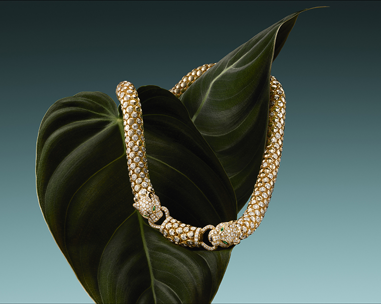ด้วยรูปทรงที่โดดเด่น งานฝีมือรังสรรค์ทองสุดประณีต และความยืดหยุ่นลื่นไหลเวลาสวมใส่ สร้อยคอเสือแพนเตอร์แบบหันหน้าเข้าหากันชิ้นนี้ได้สานต่อมรดกความคิดสร้างสรรค์ของ ฌาน ตูแซงต์ ผู้ปลุกดีไซน์อันกล้าแกร่งให้กลับมามีชีวิตอีกครั้งในช่วงทศวรรษ 1950 สร้อยคอชิ้นนี้ประดับด้วยเพชรทั้งเส้น และฝังเพชรบนศีรษะของเสือแพนเตอร์เช่นกัน
