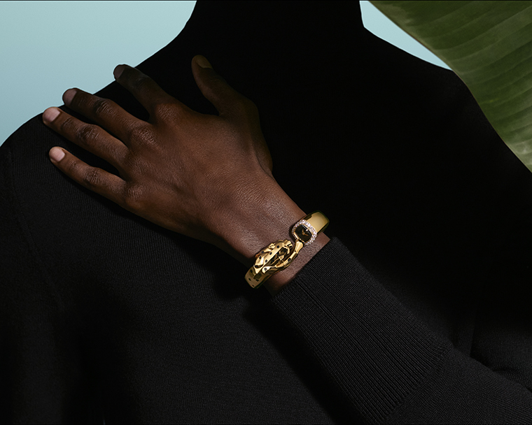 เส้นสายบริเวณไหล่และหลังของนาฬิกาเครื่องประดับชิ้นนี้ชวนให้นึกถึงเสือแพนเตอร์ที่ทั้งทรงพลังแต่ยังคงขี้เล่น ชั่วขณะที่ยกเท้าอันปราดเปรียวขึ้นมาราวกับเวลาหยุดเคลื่อนไหว แต่ละจุดของเสือแพนเตอร์มีความเฉพาะตัว รูปร่างไม่สม่ำเสมอ และวางบนมิติที่ต่างกัน ทำให้ดูมีชีวิตและเป็นธรรมชาติ โดยรายละเอียดเฉพาะเหล่านี้ถือเป็นเอกลักษณ์ของคาร์เทียร์อย่างแท้จริง