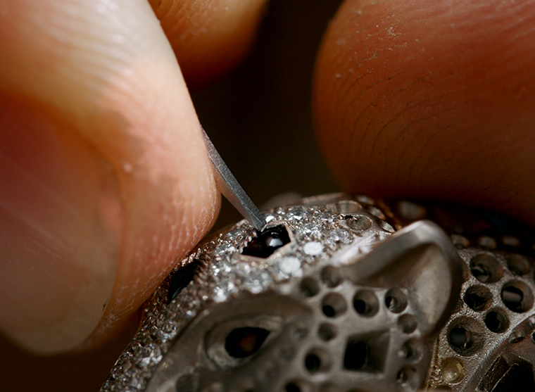 เมื่อสังเกตเสือแพนเตอร์อย่างละเอียด จะเห็นลวดลายอันประณีตตัดผ่านทองหรือแพลทินัม เทคนิคนี้รังสรรค์เพื่อจุดประสงค์เพียงอย่างเดียวคือทำให้ชิ้นงานเครื่องประดับดูราวกับมีชีวิตขึ้นมา ขนาดของอัญมณีถูกเลือกสรรอย่างพิถีพิถันเพื่อให้เข้ากับดีไซน์ พื้นที่ที่ประดับเพชรจะถูกทำให้เป็นสามมิติ สร้างเอฟเฟกต์ต่อเนื่องดุจประติมากรรมเพื่อเน้นทุกสัดส่วนของเสือแพนเตอร์ให้สมจริง ตั้งแต่ท่ายืนองอาจจนถึงย่างก้าวเดิน ขนาดของเพชรถูกกำหนดให้สอดคล้องกับกล้ามเนื้อ รายละเอียดทุกส่วนถูกซ่อนใต้พื้นผิวเพื่อให้มองไม่เห็นโลหะ จะเห็นเพียงการเคลื่อนไหวของเสือแพนเตอร์เท่านั้น