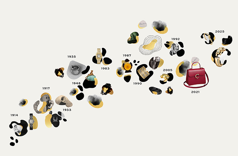 จากยุคหนึ่งสู่อีกยุคหนึ่ง ช่างอัญมณีได้ถักทอเรื่องราวของเสือแพนเตอร์ผ่านผลงานที่โดดเด่นด้วยความกล้าหาญและความคิดสร้างสรรค์ เรื่องราวทั้งหมดเริ่มต้นขึ้นที่บูติคเลขที่ 13 รูว์ เดอ ลา เป (rue de la Paix) บ้านเกิดของเมซงในปี 1914 เสือแพนเตอร์ปรากฏตัวครั้งแรกบนเรือนเวลาประดับออนิกซ์และเพชร และในปีเดียวกันนั้น เสือแพนเตอร์ยังปรากฏตัวบนบัตรเชิญร่วมงานนิทรรศการเครื่องประดับ ซึ่งคาร์เทียร์มอบหมายให้ศิลปิน จอร์จ บาร์เบียร์ (George Barbier) รังสรรค์ จากนั้น ภายใต้การนำของ ฌาน ตูแซงต์ (Jeanne Toussaint) ผู้ดำรงตำแหน่งผู้อำนวยการฝ่ายสร้างสรรค์ในปี 1933 เสือแพนเตอร์ได้วิวัฒนาการไปเป็นผลงานประติมากรรมสามมิติเป็นครั้งแรก