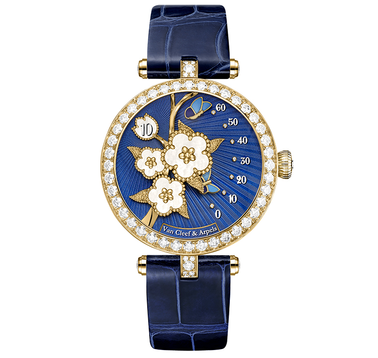 นาฬิกาข้อมือระบบซ้อนกลไก “ผีเสื้อบอกเวลา” Lady Lucky Spring Butterfly มอบความละเมียดละไมในอารมณ์ให้กับทุกครายามก้มลงดูหน้าปัดรองรับศิลปะจัดตำแหน่งดอกเหมยแม่มุกขาวเดินขอบลูกปัดทองคำสีเหลืองต่างมิติขนาดทั้งสามให้ลดหลั่นไล่ระดับความสูงเหนือกิ่งทองคำขัดเงาตัดกับเนื้อทองแต่งรายละเอียดของกลีบใบท่ามกลางงานเดินขอบลูกปัดทองเช่นเดียวกับ “กรอบหน้าต่าง” รูปทรงดอกตูมลิลลี-ออฟ-เธอะ-วัลเลย์เป็นช่องว่างเผยให้เห็นแผ่นจานหมุนแม่มุกขาวติดตั้งตัวเลขบอกชั่วโมงภายในกรอบตัวเรือนอยู่ด้านล่างพื้นหน้าปัด ตัดเฉดกับช่อดอกไม้อย่างงามสง่าด้วยการใช้แผ่นแม่มุกขาวสลักลายริ้วรัศมีตะวัน “กวิโญเช” (guilloche) เคลือบสีน้ำเงินสดเข้ม ลูกเล่นลายร่องเส้นตรงจากงานสลักยังอำนวยต่อการรับแสงตกกระทบ ให้พื้นผิวอินทรีย์ วัตถุธรรมชาติสะท้อนประกายสว่างเรืองรองรอบทิศทาง