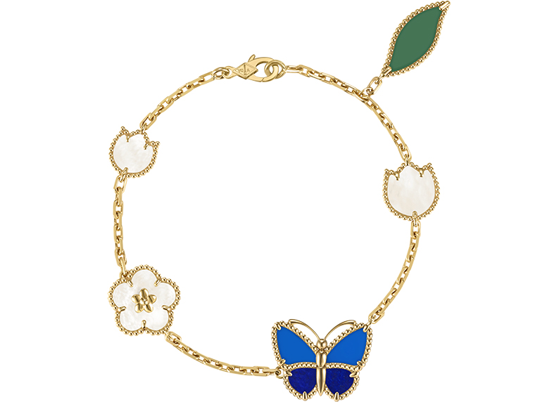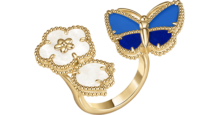 เครื่องประดับแต่ละชิ้น แต่ละรุ่นในคอลเลกชัน Lucky Spring ล้วนจุดประกายปรารถนาให้ครอบครองจากงานออกแบบรังสรรค์พรรณพฤกษา และเหล่าแมลงต่างความหมายมงคล ไม่ว่าจะเป็นดอกเหมย ตัวแทนแห่งความหวัง ความอดทน, ลิลลี-ออฟ-เธอะ-วัลเลย์ ดอกไม้นำโชคประจำฤดูใบไม้ผลิ สัญญาณแห่งการเริ่มต้นใหม่ หรือเต่าทอง แมลงปีกแข็งที่นำความสุขสมปรารถนามาสู่ผู้พบเจอ ให้มาอยู่ร่วมกันท่ามกลางช่อใบไม้เขียวขจี สำหรับผลงานรุ่นใหม่ในปีนี้ ผีเสื้อเจ้าของปีกบอบบางหลากสีสัน ตัวแทนแห่งอิสระ และการเปลี่ยนแปลงสู่ความสำเร็จ อีกทั้งยังเป็นส่วนหนึ่งของมรดกทางการสร้างสรรค์ของเมซงมานับแต่ปีค.ศ. 1906 ได้เข้ามาโบยบิน เติมเต็มความครบครันให้แก่คอลเลกชันผ่านการเรียงร้อยแผ่นโมราสีฟ้าสดเป็นคู่ปีกบนอยู่เหนือคู่ปีกล่างทำจากพลอยน้ำสมุทรลาพิซ ลาซูลิตัดเฉดกับตัวเรือนทองคำสีเหลืองเดินขอบลูกปัดทองเรียงแถวคู่ขนาน สะท้อนรสนิยมอันเป็นเลิศในการเลือกสรรรัตนชาติของ Van Cleef & Arpels