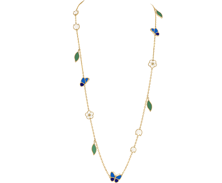 จากคอลเลกชันเครื่องประดับตัวเรือนทองคำสีกุหลาบมาสู่ผลงานล่าสุดของ Lucky Spring ในปีนี้ ด้วยความหลากหลายของตัวเรือนทองคำสีเหลืองห้าแบบใหม่ ประกอบไปด้วยหนึ่งสร้อยคอยาว, สร้อยข้อมือร้อยโมทิฟห้าแม่ลาย, เข็มกลัด, แหวนหว่างนิ้ว และต่างหูหนึ่งคู่ สำหรับสร้อยคอยาว มอบความอ่อนช้อยจากงานร้อยโมทิฟผีเสื้อกางปีกสามตัวสลับ คั่นกับโมทิฟแม่ลายอื่นบนสายโซ่โดยอาศัยการจัดสัดส่วนอสมมาตร พร้อมบ่งบอกถึงความพิถีพิถัน ใส่ใจต่อทุกรายละเอียดอย่างเหนือชั้นของเมซงผ่านงานฝีมือหล่อแบบด้วยเทคนิคสูญขี้ผึ้ง (lost-wax casting) อันเก่าแก่ที่แทบจะหาไม่ได้จากเมซงเครื่องประ- ดับแห่งอื่น ร่วมกับงานตกแต่งเก็บรายละเอียดอันรวมถึงความประณีตบรรจงในการขัดผิวทั้งทางด้านหน้า และด้านหลัง ตลอดจนลูกปัดทองกลมกลึงเรียงแถวเดินขอบซ้อนสองชั้นเพื่อให้ยามแกว่งไกวพลิกกลับไปมาสามารถเผยความงดงามตามธรรมชาติของแมลงตัวน้อยเจ้าของปีกบอบบางจรัสประกายสีได้อย่างสมจริง