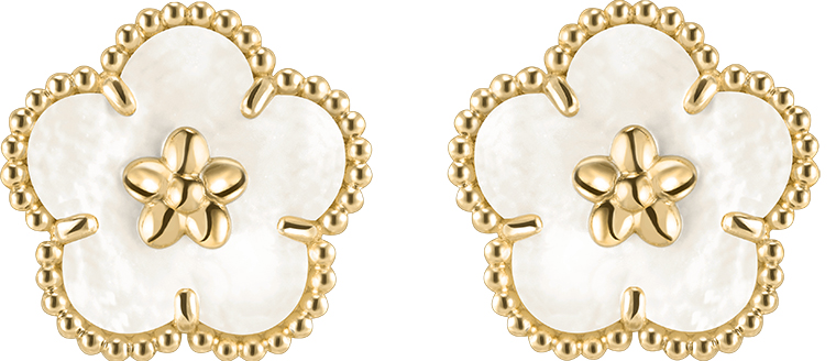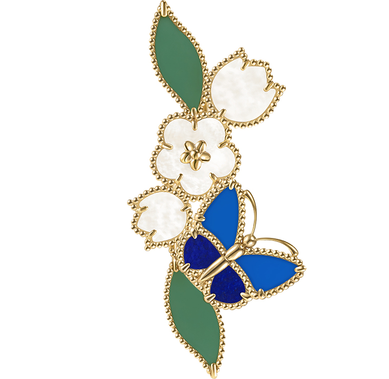 แหวนหว่างนิ้วหรือ Between the Finger ring เป็นหนึ่งในสัญลักษณ์ทางงานออกแบบของ Van Cleef & Arpels ด้วยการใช้โครงสร้างตัวเรือนวงแหวนปลายเปิดร่วมกับลูกเล่นอสมมาตรทางการตกแต่ง เช่นเดียวกับผลงานรุ่นใหม่ในคอลเลกชันประจำฤดูกาลนี้ ขณะที่ปลายข้างหนึ่งรองรับลูกเล่นจัดตำแหน่งต่างระดับของโมทิฟมาเธอร์-ออฟ-เพิร์ลสีขาวเดินขอบลูกปัดทองแม่ลายดอกเหมยผลิบานกับดอกตูมลิลลี-ออฟ-เธอะ-วัลเลย์ ปลายเปิดฝั่งตรงข้ามคือความงามสง่าของผีเสื้อกางปีกเดินขอบ และเดินเส้นลูกปัดทองกลมกลืนกับตัวเรือนทองคำสีเหลืองจรัสประกายสุกสกาวราวแสงแรกแห่งฤดูใบไม้ผลิ เพื่อเติมเต็มความอ่อนช้อย วิจิตรบรรจง เข็มกลัดคู่ดอกไม้ต่างสายพันธุ์บนหัวแหวนยังมาปรากฏอย่างโดดเด่นบนเข็มกลัดประดับกลีบใบเขียวขจีของโมรา ส่วนต่างหูดอกเหมยห้ากลีบแม่มุกขาวประดับช่อเกสรทองคำห้าแฉกตรงกึ่งกลางกลมกลืนกับงานเดินขอบลูกปัดทองกลมกลึงทวีความคมชัดให้แก่เส้นโค้งวงกลีบ ถ่ายทอดความแข็งแกร่งอันเป็นคุณลักษณ์ธรรมชาติของไม้ดอกที่สามารถผลิบานอย่างงามสง่าแม้อยู่ท่ามกลางสภาพอากาศหนาวเหน็บภายใต้หิมะโปรยปรายตลอดเหมันต์