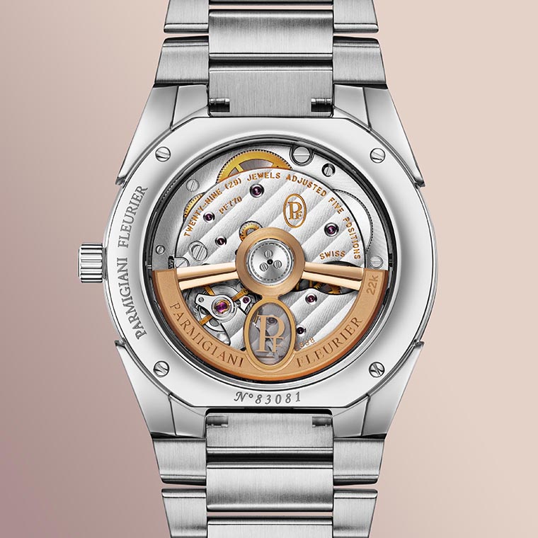 Alta Rosa ขับเคลื่อนด้วยกลไกระบบอัตโนมัติ คาลิเบอร์ PF770 ซึ่งพัฒนาและผลิตขึ้นภายในโรงงานของ Parmigiani Fleurier กลไกนี้ทำงานที่ความถี่ 28,800 ครั้งต่อชั่วโมง พร้อมสำรองพลังงาน 60 ชั่วโมง ผสานความเชื่อถือได้เข้ากับการตกแต่งอย่างประณีต สามารถมองเห็นได้ผ่านฝาหลังแซฟไฟร์ ซึ่งเผยให้เห็นลาย Côtes de Genève และสะพานกลไกที่ลบเหลี่ยมด้วยมือ โรเตอร์ทองคำโรสโกลด์ 22k แบบเจาะโปร่งที่ผ่านการขัดเงาและพ่นทราย สะท้อนโทนสีของหน้าปัดอย่างแนบเนียน อีกครั้งที่แนวคิดแห่งความต่อเนื่องมีความสำคัญเหนือความแตกต่าง