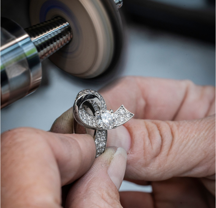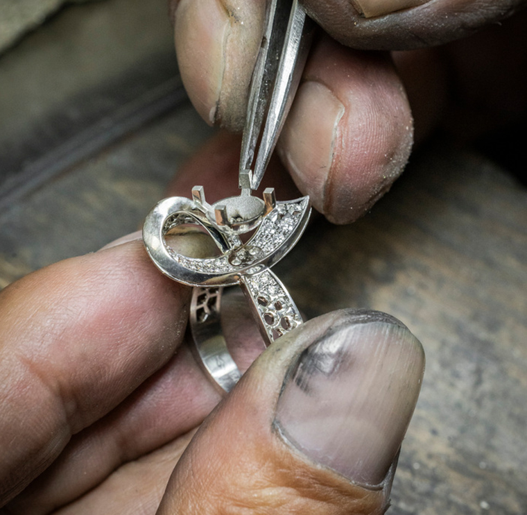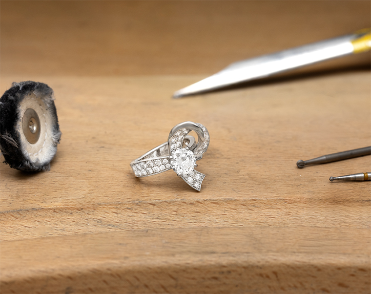 แต่ละโค้งสัณฐานล้วนถูกออกแบบอย่างพิถีพิถัน ให้ได้ตำแหน่งสะท้อนแสงตกกระทบ และเมื่อนำโครงสร้างตัวเรือนเปิดโปร่งมารองรับงานฝังเพชรจิกไข่ปลา แหวน Boucle solitaire หรือ “ห่วงริบบินมัดปมรองเพชรเดี่ยว” คือบทสรุปแห่งศิลปะเล่นแสงระยับประกายสะกดสายตาอย่างแท้จริง