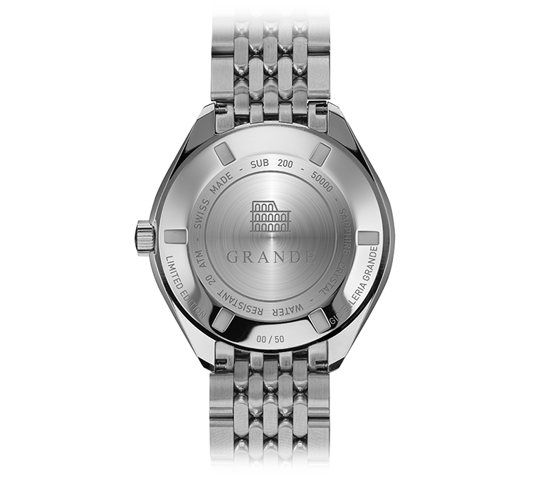 สิ่งที่ทำให้รุ่นนี้แตกต่างจาก SUB 200 รุ่นมาตรฐานคือรายละเอียดการออกแบบที่สะท้อนเอกลักษณ์ของกรุงโรมอย่างงดงาม พื้นหน้าปัดได้รับการออกแบบในสไตล์ไล่เฉดสีอย่างประณีต สร้างมิติของแสงและความลึกให้กับพื้นผิวหน้าปัด ทำให้นาฬิกาดำน้ำเรือนนี้มีความสง่างามมากขึ้นกว่าปกติ