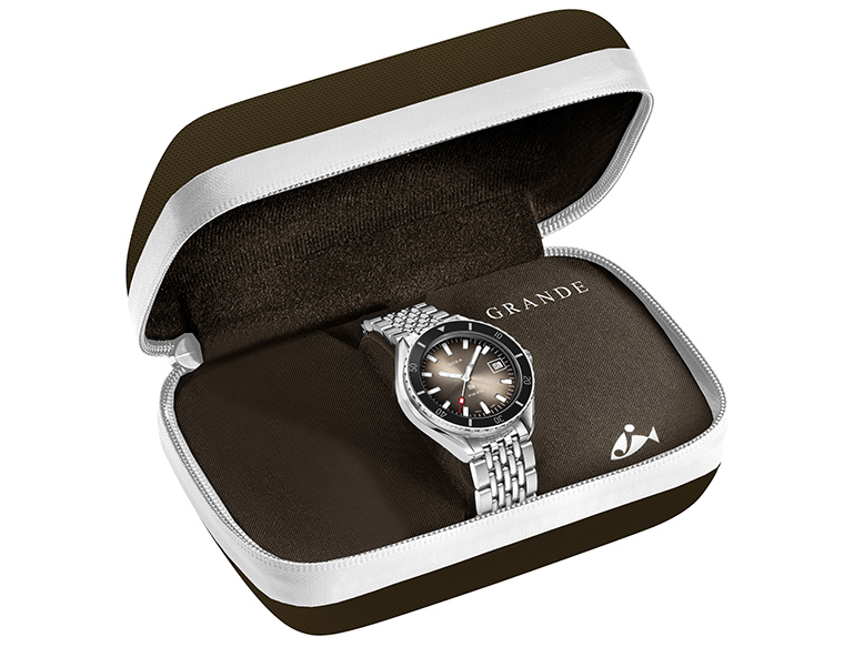 ภายในกล่องยังมีสายผ้า NATO สี น้ำตาลอ่อน อีกหนึ่งเส้น เพื่อเพิ่มทางเลือกในการสวมใส่ในสไตล์ที่ผ่อนคลายยิ่งขึ้น ผลลัพธ์คือเรือนเวลาที่ผสมผสานความ แข็งแกร่งของนาฬิกาดำน้ำกับความสง่างามแบบอิตาเลียน ได้อย่างลงตัว ในราคาที่แข่งขันได้อย่างน่าสนใจที่ 1,590 ยูโร