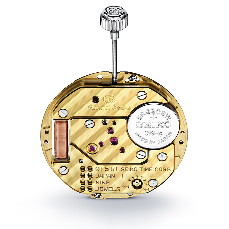 กลไก Caliber 9F เปิดตัวครั้งแรกในปี 1993 ได้รับการออกแบบมาเพื่อเป็นสุดยอดกลไกควอตซ์ ที่ผสานสมรรถนะอันยอดเยี่ยมเข้ากับความงามที่เหนือกาลเวลา มอบความเที่ยงตรงระดับ ±10 วินาทีต่อปี พร้อมสวิตช์ปรับแต่งความแม่นยำด้วยมือระหว่างการเซอร์วิส กลไก Backlash Auto-Adjust ที่ช่วยขจัดการสั่นกระตุกของเข็มวินาที และมอเตอร์ Twin Pulse Control ที่สร้างแรงบิดเพียงพอสำหรับเข็มขนาดใหญ่ของ Grand Seiko ทุกชิ้นส่วนของกลไกนี้ถูกประกอบด้วยมือโดยช่างนาฬิกาแห่ง Shinshu Watch Studio พร้อมการคัดเลือกคริสตัลควอตซ์ที่ผ่านการบ่มนานสามเดือนอย่างพิถีพิถันทีละชิ้น และวงจร IC ที่ช่วยชดเชยการเบี่ยงเบนใด ๆ ที่อาจเกิดจากปัจจัยภายนอกอย่างเช่นอุณหภูมิ เพื่อให้ได้ความเสถียรของอัตราการเดินที่ยอดเยี่ยมไม่ว่าจะอยู่ในสภาพอุณหภูมิใดก็ตาม