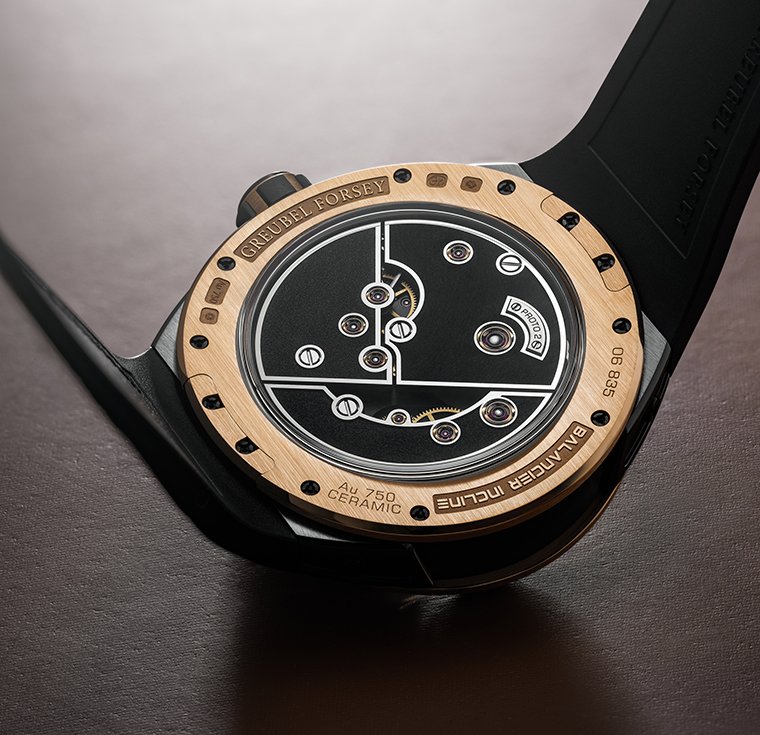 หัวใจสําคัญของกลไกชุดนี้คือ ระบบจักรกรอกหรือ Balance wheel ที่วางเอียงทํามุม 30 องศา อันเป็นเอกลักษณ์ของ Greubel Forsey ซึ่งถูกจัดวางให้เป็นทั้งจุดศูนย์กลางทางสายตา และศูนย์กลางแห่งความเที่ยงตรงของเรือนเวลา โครงสร้างกลไกถูกออกแบบโดยเน้นความโปร่งและมิติในเชิงลึก ประกอบด้วยสะพานจักรแบบเล่นระดับและโครงสร้างแบบลอยตัวที่ตั้งใจเผยให้เห็นการทํางานของจักรกลแทนที่จะซ่อนไว้ภายในด้วยชิ้นส่วนทั้งหมด 301 ชิ้น และชุดจักร Escapement Platform อีก 68 ชิ้น กลไกชุดนี้จึงเป็นการผสมผสานระหว่างความโปร่งเบา ทางโครงสร้างและความซับซ้อนทางเทคนิคที่อัดแน่นไว้ด้วยกัน ตลับลานคู่แบบหมุนเร็วมอบสารองพลังงานที่เปี่ยมด้วยความเที่ยงตรงยาวนานถึง 72 ชั่วโมง ในขณะที่จักรกรอกแบบปรับค่าแรงเฉื่อย ซึ่งผลิตขึ้นเองในเวิร์กช็อป พร้อมสกรูทองคําปรับตั้งเวลา 6 หลัก ทํางานด้วยความถี่ 21,600 ครั้งต่อชั่วโมง