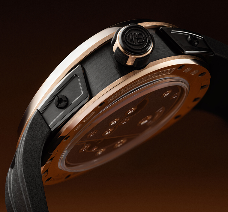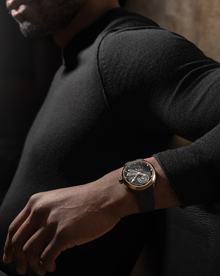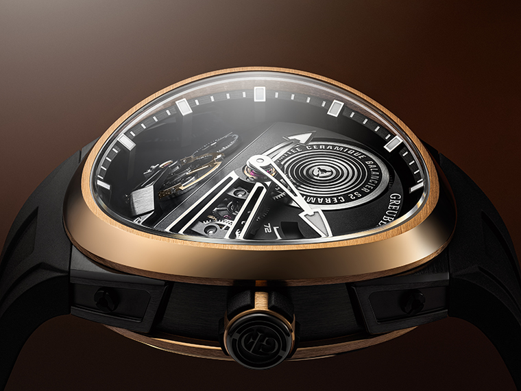 รุ่นตัวเรือนเซรามิกสีดําและทอง 5N red gold มุ่งเน้นการแสดงความต่างและมิติเชิงลึก โดยชิ้นส่วนกลไกที่ผ่านการเคลือบสีดําและตัวเรือนเซรามิกทําหน้าที่เป็นดั่งกรอบที่โอบล้อมโครงสร้างสถาปัตยกรรมภายในเอาไว้ ในขณะที่ขอบตัวเรือนและฝาหลังทองเรดโกลด์ช่วยเติมเต็มความอบอุ่นและสร้างนํ้าหนักทางสายตาที่โดดเด่นการสอดประสานกันระหว่างพื้นผิวแบบด้าน และแบบขัดเงา ช่วยขับเน้นบุคลิกอันเป็นสามมิติของกลไกให้เด่นชัดยิ่งขึ้น พร้อมกับตอกย้ำลักษณะอันเป็นประติมากรรมของตัวเรือนทรง Convexe ได้อย่างสง่างาม