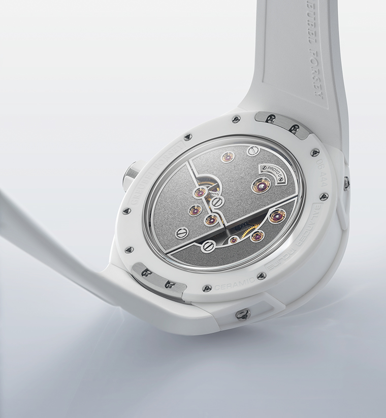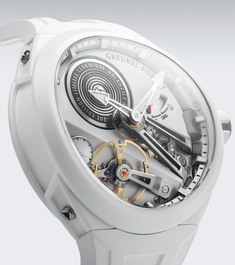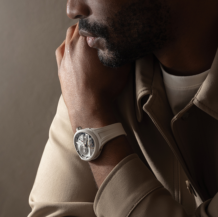 ในรุ่นตัวเรือนเซรามิกสีขาวนั้นเป็นการนําเสนอในทิศทางที่ตรงกันข้าม โดยตัวเรือนสีอ่อนแบบคุมโทนช่วยขับเน้นความโปร่งตาและความแม่นยํา เปิดโอกาสให้กลไกภายในเผยความโดดเด่นผ่านการตกกระทบของแสงและเงา ผลลัพธ์ที่ได้คือภาพลักษณ์ที่ดูเป็นเชิงเทคนิคและมีความเป็นกราฟิกชัดเจนยิ่งขึ้น โดยให้ตัวโครงสร้างทําหน้าที่เป็นภาษาหลักในการสื่อสารทางสายตา นอกจากนี้วัสดุเซรามิกสีขาวยังช่วยขับเน้นความบริสุทธิ์ของรูปทรงเรขาคณิตแบบ Convexeให้เด่นชัด ในขณะที่ยังคงรักษาความลึกเชิงกลไกและการอ่านค่าเวลาที่ยอดเยี่ยมไว้เช่นเดิม