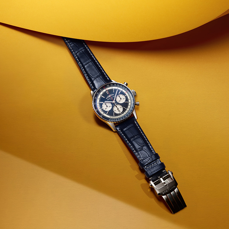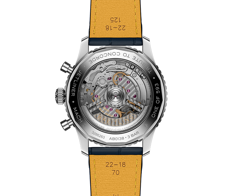 สำหรับนาฬิกา Navitimer B01 Chronograph 43 Tribute to Concorde (Ref. B01389C1C1P1) มาพร้อมตัวเรือนสตีลขนาด 43 มิลลิเมตร พร้อมหน้าปัดสีน้ำเงินที่ได้รับแรงบันดาลใจจากเฉดสีของชั้นบรรยากาศสตราโตสเฟียร์ที่มองเห็นได้จากเครื่องบิน จับคู่กับสายหนังจระเข้สีเดียวกัน หน้าปัดย่อยสีขาวที่ตัดกันและไม้บรรทัดคำนวณด้านในอ้างอิงถึงชื่อเล่นของคอนคอร์ดว่า L’Oiseau Blanc ผลิตจำนวนจำกัดเพียง 593 เรือน ซึ่งเป็นการอ้างอิงถึงเครื่องยนต์เทอร์โบเจ็ท Olympus 593 ที่ขับเคลื่อนเครื่องบินลำนี้ ฝาหลังของตัวเรือนสลักข้อความว่ า “One of 593,” “Tribute to Concorde,” “Jetliner,” และ “Mach 2,ซึ่งเป็นความเร็วในการบินของเครื่องบินที่ทะลุผ่านกำแพงเสียง
