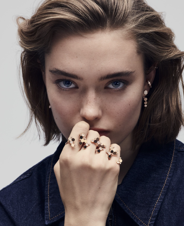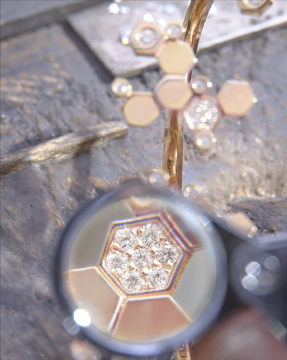 หวนชวนให้นึกถึงรูปทรงของรังผึ้งในสภาวะตามธรรมชาติสี่ชิ้นงานอันโดดเด่น ได้เข้ามาเติมเต็มให้กับคอลเลกชันนี้ด้วยการเล่นกับแสงและมิติของรูปทรงผสานทองคำขัดเงาแบบสะท้อนเงา การฝังเพชรแบบพาเว่และแบบเบเซลแหวนที่โดดเด่น ทั้งความละเมียดละไมและความโดดเด่นที่สะดุดตา โอบรับทั้งมือด้วยรูปทรงโมเดิร์นอันเหนือความคาดหมายพร้อมประดับอัญมณีอย่างวิจิตร
