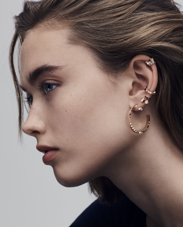 กำไลข้อมือหนึ่งในชิ้นงานสำคัญของคอลเลกชันมีการปรับดีไซน์โดยมีรูปทรงที่กว้างขึ้นและรังสรรค์จากแร่แพลทินัมขัดเงาแบบสะท้อนแสงออกแบบให้เปิดเล็กน้อยบริเวณข้อมืออย่างงดงามขณะเดียวกันคอลเลกชันต่างหูได้ปรับเปลี่ยนสองดีไซน์ใหม่โดยมีเอียร์คัฟสีโรสโกลด์ที่ละเอียดอ่อนช่วยประดับใบหูด้วยลวดลายกึ่งพาเว่อันเป็นเอกลักษณ์และต่างหูระย้าแบบขยับได้หนึ่งคู่ซึ่งมีให้เลือกทั้งในโรสโกลด์กึ่งพาเว่หรือไวท์โกลด์กึ่งพาเว่