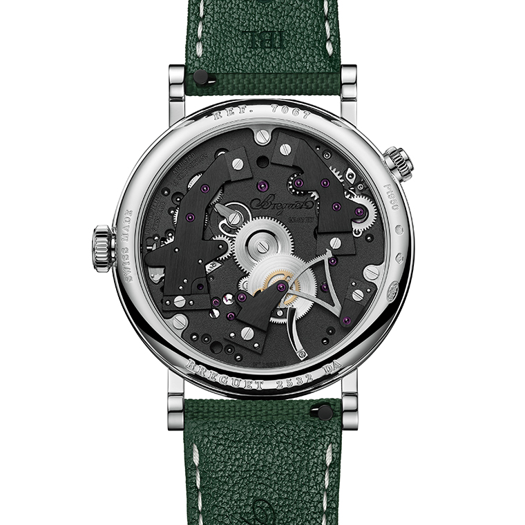 ความท้าทายยิ่งเพิ่มขึ้นไปอีก เนื่องจากหน้าปัดเหล่านี้ไม่ได้ถูกซ่อนอยู่ใต้โครงสร้างตัวเรือนเช่นทั่วไป ยิ่งไปกว่านั้น เช่นเดียวกับใน Tradition 7037 การเลือกใช้ตัวเลขอารบิกยังสะท้อนถึงความจงรักภักดีต่อจิตวิญญาณของ Breguet พร้อมมอบความชัดเจนในการอ่านค่าจากสีเงินของตัวเลขที่ตัดกับขอบหน้าปัดสีดำ