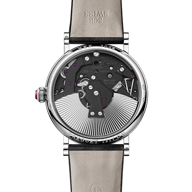 เพื่อรักษาความสมมาตร ระบบกันกระแทก pare-chute ซึ่งเป็นนวัตกรรมเอกลักษณ์ของ Breguet ถูกวางไว้ที่ตำแหน่ง 4 นาฬิกา ทำหน้าที่ปกป้องแกนบาลานซ์จากแรงกระแทก กลไกถูกบรรจุในตัวเรือนโรสโกลด์ 18K ขนาด 40 มิลลิเมตร พร้อมกลไก คาลิเบอร์ 505 SR1 ที่มีหมายเลขเฉพาะ และพลังงานสำรอง 50 ชั่วโมง ขับเคลื่อนด้วยโรเตอร์ไวท์โกลด์รูปทรงเดียวกับที่ A.-L. Breguet ออกแบบเมื่อ 250 ปีก่อน นาฬิกามาพร้อมสายหนังลูกวัวสีเทา และยังมีตัวเลือกสายยางลายหนังสีเทาแบบเย็บตะเข็บ