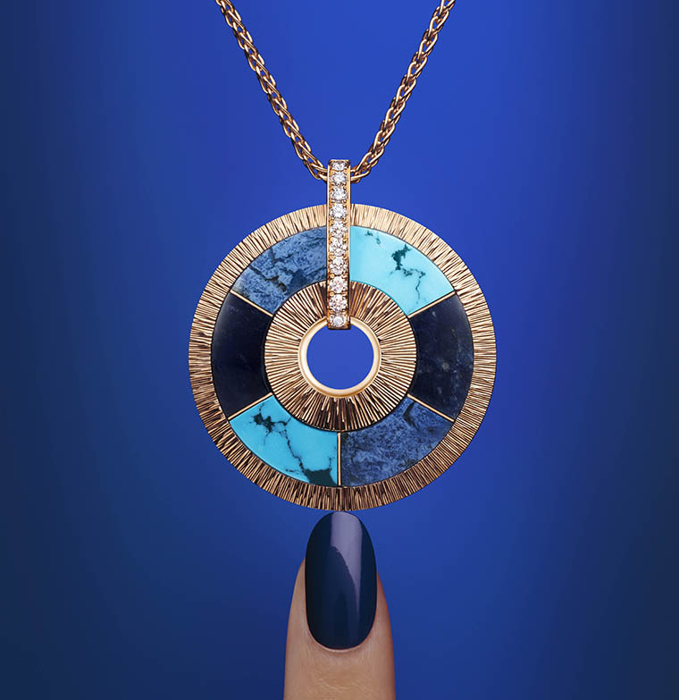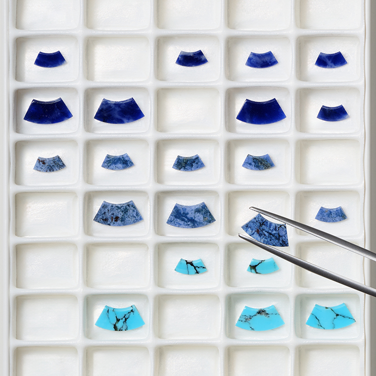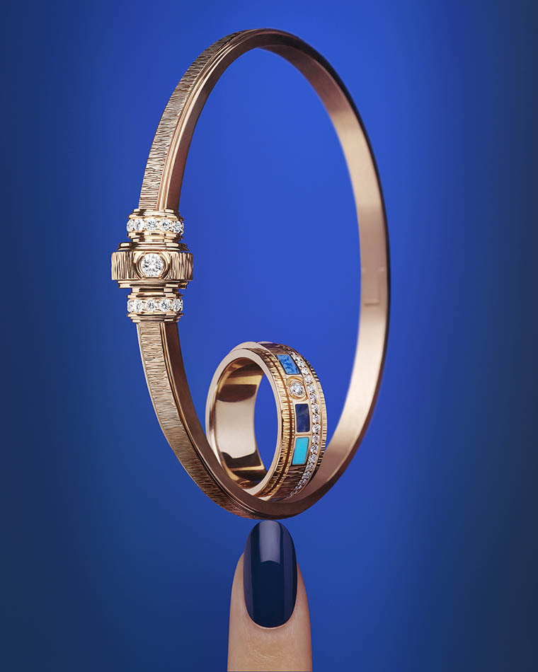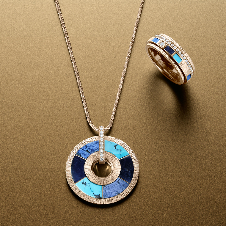 สำหรับ Piaget สีน้ำเงินคือหนึ่งในอัตลักษณ์ที่อยู่เคียงคู่บนชิ้นงานอันโดดเด่นมาตลอดประวัติศาสตร์ของเมซง — “Piaget Blue” จึงมิใช่เพียงสีสันหนึ่ง แต่เป็นดั่งมรดกแห่งศิลปะที่ส่งต่อจากรุ่นสู่รุ่น เป็นสายใยที่เชื่อมโยงระหว่างประเพณีและอนาคตอย่างงดงาม — สีน้ำเงินที่ได้จาก 3 อัญมณีจากธรรมชาติอย่าง เทอร์ควอยซ์ ที่มีความสดใส ผสานเข้ากับความลุ่มลึกของ โซดาไลต์ และ ดูมอร์เทียไรต์ สู่คอลเลกชั่น “Possession Vibrant Palace” ประกอบด้วยชิ้นงานที่มีความงดงามและความมีชีวิตชีวา นำเสนอการรังสรรค์โมเสกหินสีผสมผสานกับเทคนิคช่างทองอันเป็นเอกลักษณ์ของเมซง อย่างการแกะสลักลวดลาย Décor Palace ควบคู่กับอัญมณีล้ำค่า เน้นย้ำรายละเอียดอันแวววาวของโรสโกลด์ ร่องลายกาดรูนขัดเงา เพชรที่ฝังแบบครึ่งเสี้ยวและอัญมณีหลากเฉดสีที่จัดวางแบบอสมมาตร ความต่างของผิวสัมผัสหิน การใช้รูปทรงสี่เหลี่ยมสลับกับทรงรี ความลึกของเฉดสี และการตกกระทบของแสง ทั้งหมดผ่านการรังสรรค์จากทักษะที่ได้รับการสั่งสมมาอย่างยาวนาน ถักทอเข้าด้วยกันจนเกิดเป็นชิ้นงานราวกับผลงานศิลปะที่เปี่ยมด้วยความมีชีวิตชีวา รวมถึงการหลอมรวมของหินสีน้ำเงินทั้ง 3 เฉด เปลี่ยนเครื่องประดับให้กลายเป็นดั่ง "เครื่องรางอันล้ำค่า" จากการเรียงร้อยให้เป็นรูปทรงวงกลมอันเป็นสากลซึ่งสื่อถึงความมั่งคั่งและโชคลาภในหลายวัฒนธรรม