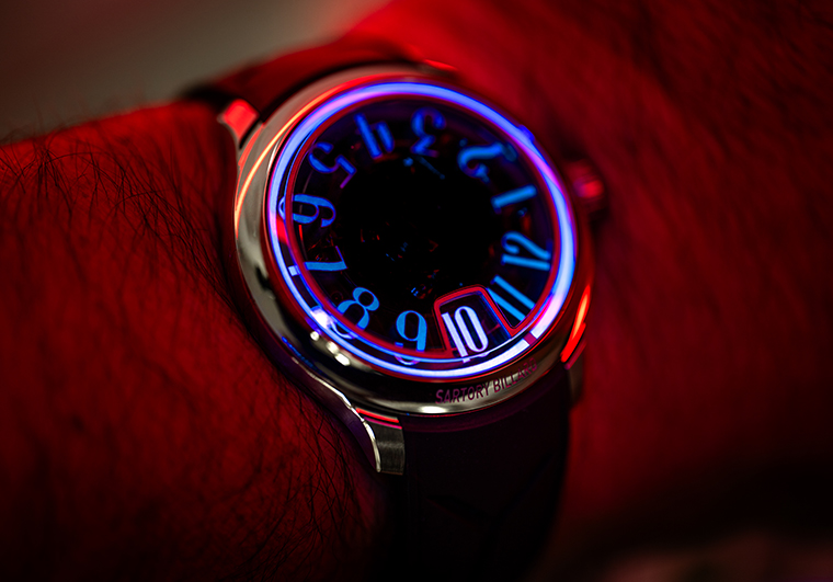 SB10 เปลี่ยนการใช้เข็มนาฬิกาแบบเดิมๆ มาเป็นจาน Sapphire ที่มีวงแหวนเคลือบสารเรืองแสง Super-LumiNova BGW9 (ซูเปอร์-ลูมิโนวา ) ซึ่งจะ หมุนครบรอบทุก ๆ 60 นาที โดยมีเครื่องหมายสีแดงสดคอยระบุตําแหน่งนาทีที่แม่นยําภายในวงแหวนเรืองแสงนี้ การเคลื่อนที่นั้นนุ่มนวล เงียบสงบ และชวนให้หลงใหลราวกับการโคจรที่ไร้เสียง เป็นจังหวะที่เชื่องช้าจนให้ความรู้สึกราวกับว่าเวลาเองกําลังหายใจอยู่ ในยามค่ําคืน วงแหวนจะกลายเป็น วงรัศมีสีฟ้าเทอร์คอยซ์ ที่ลอยเด่นอยู่ในความมืด เวลาจึงดูเหมือนไม่ได้เพียงแค่ไหลผ่านไป แต่มันกําลังหมุนวน การอ่านค่าเวลาจะกลายเป็นสภาวะที่ดื่มต่ำไปกับบรรยากาศ โดยมีวงกลมแห่งแสงโคจรรอบวัสดุใจกลางอย่างช้า ๆ เปรียบเสมือนปรากฏการณ์บนท้องฟ้าขนาดเล็กบนข้อมือของคุณ
