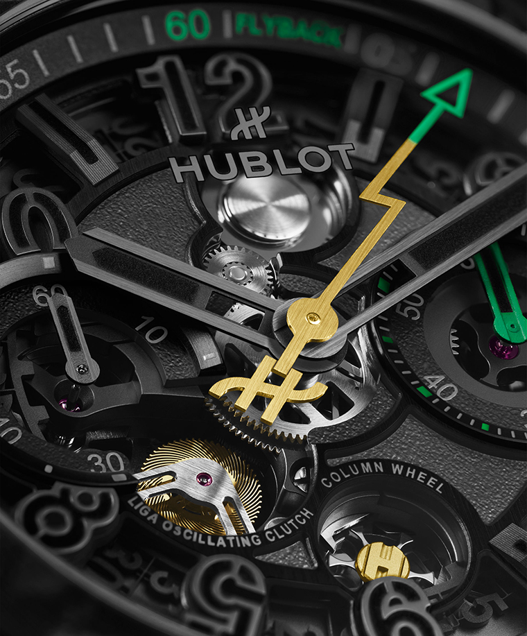 คุณสมบัติสำคัญประกอบด้วยกลไกโครโนกราฟแบบฟลายแบ็คที่ที่ผสานโครงสร้างแบบอินทิเกรต ให้ความแม่นยำระดับ 1/8 วินาที สามารถรีเซ็ตและเริ่มจับเวลาใหม่ได้ทันที พร้อมความเที่ยงตรงอยู่ที่ -2 / +4 วินาทีต่อวัน และพลังงานสำรอง 72 ชั่วโมง กลไกนี้ยังมาพร้อมนวัตกรรมที่จดสิทธิบัตรถึง 5 รายการ ได้แก่ ระบบคลัตช์แบบแกว่งที่ช่วยชดเชยระยะฟันเฟือง ระบบป้องกันการสั่นของเข็มโครโนกราฟ กลไกตัวบล็อคเฟืองจักรแบบ “ไร้แรงเสียดทาน” ระบบปรับอัตราเดินของนาฬิกาอย่างละเอียด และระบบตั้งเวลาที่สามารถทนทานต่อแรงกระแทกสูง โดยทั้งหมดผ่านการทดสอบอย่างเข้มงวดตามมาตรฐาน Chronofiable® ของ Hublot เพื่อรับประกันประสิทธิภาพ ความน่าเชื่อถือ และความเที่ยงตรงสูงสุด