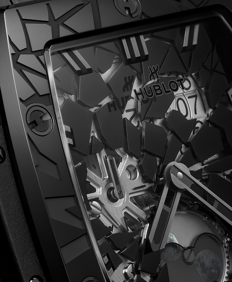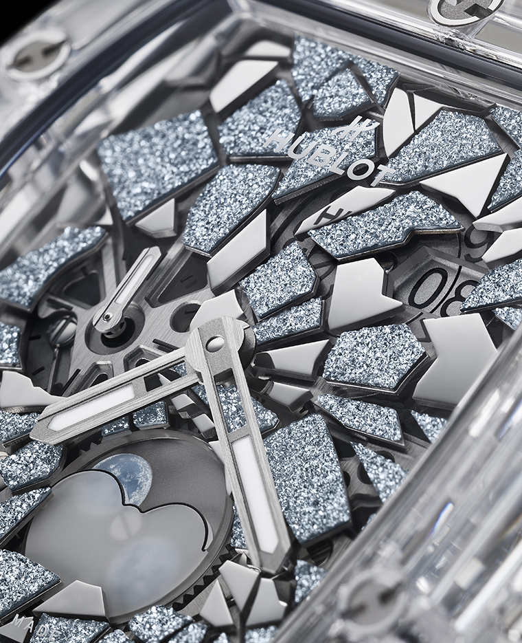 เริ่มต้นในปี 2016 กับ Big Bang Impact Bang ลวดลายที่ถูกแยกออกเป็นชิ้นส่วนนี้ได้ก้าวข้ามรูปแบบการฝังอัญมณีแบบดั้งเดิม และสร้างความโดดเด่นที่มองเห็นได้ในรูปแบบใหม่ ในปี 2026 โครงสร้างรูปแบบนี้ได้รับการพัฒนาให้ซับซ้อนยิ่งขึ้น ด้วยการผสานวัสดุตั้งแต่เพชรไปจนถึงออสเมียม ควบคู่กับการตกแต่งผิวขัดเงาชุบโรเดียมและองค์ประกอบเคลือบสีดำ เศษเสี้ยวรูปทรงต่าง ๆ แผ่กระจายจากขอบตัวเรือนไปสู่หน้าปัดแซฟไฟร์ ขณะที่บางชิ้นส่วนล้อมรอบมูนเฟส ณ ตำแหน่ง 6 นาฬิกา โดยทุกชิ้นถูกจัดวางด้วยมืออย่างบรรจง และยึดอย่างมั่นคงด้วยความแม่นยำระดับไมครอน
