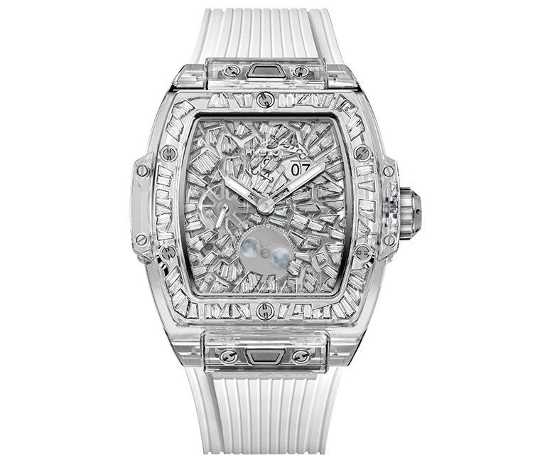 10 ปีหลังจากการเปิดตัว Big Bang Impact Bang (บิ๊ก แบง อิมแพ็ค แบง) ในปี 2016 ซึ่งโดดเด่นด้วยลวดลายแยกส่วนที่เชื่อมต่อกันอย่างลงตัวและการจัดวางเพชรแฟนซีคัตอย่างแม่นยำ Hublot (อูโบลท์) ได้นำแนวคิดการออกแบบนี้มาต่อยอดสู่วัสดุแซฟไฟร์และเซรามิก พร้อมการคิดค้นที่ก้าวข้ามขีดจำกัดไปอีกขั้นด้วยการฝังเพชรลงบนแซฟไฟร์โดยตรงเป็นครั้งแรกของแบรนด์กับ Spirit of Big Bang Impact (สปิริต ออฟ บิ๊ก แบง อิมแพ็ค) เปิดตัวใน 3 รุ่นลิมิเต็ด ครอบคลุมวัสดุตั้งแต่ เซรามิกสีดำสนิท, แซฟไฟร์และออสเมียม และแซฟไฟร์ประดับเพชร