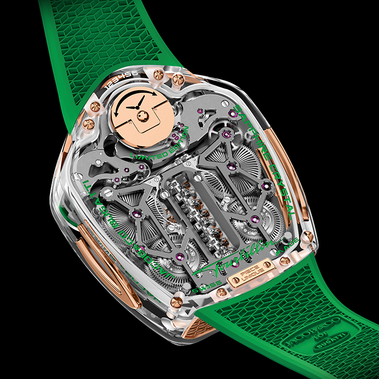 ตัวเรือน Bugatti Tourbillon Sapphire Crystal ขนาด 54 x 44 มม. ถือเป็นงานออกแบบที่ซับซ้อนอย่างยิ่งเมื่อรังสรรค์ ด้วยวัสดุที่ท้าทายเช่นนี้ ความโปร่งใสแบบ 360 องศาเผยให้เห็นรายละเอียดทุกองค์ประกอบภายในโดยไม่ปิดบังสิ่งใดเลย