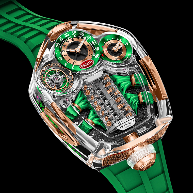 เพื่อเฉลิมฉลองสถาปัตยกรรมเครื่องยนต์ของ Bugatti Tourbillon ทาง Jacob & Co. ได้สร้างออโตมาตอนจําลอง เครื่องยนต์ V16 ขนาดจิ๋วขึ้นจากการสลักบล็อกแซฟไฟร์โปร่งใสทั้งชิ้น โดยเจาะเป็นกระบอกสูบ 16 ช่อง ภายในบรรจุ ลูกสูบไทเทเนียม 16 ชุดที่ขับเคลื่อนด้วยเพลาข้อเหวี่ยงแกนเดียว ถือเป็นหนึ่งในชิ้นส่วนที่ยาวที่สุด ซับซ้อนที่สุด และ บอบบางที่สุดที่เคยถูกสร้างขึ้นในโลกการประดิษฐ์นาฬิกา เมื่อเริ่มการทํางาน เพลาข้อเหวี่ยงจะหมุนและลูกสูบทั้ง 16 จะเคลื่อนขึ้นลงตามลําดับ สร้างภาพเคลื่อนไหวที่สมจริงราวกับเครื่องยนต์ Bugatti กําลังทํางานอยู่ภายในตัวเรือน แซฟไฟร์ใส