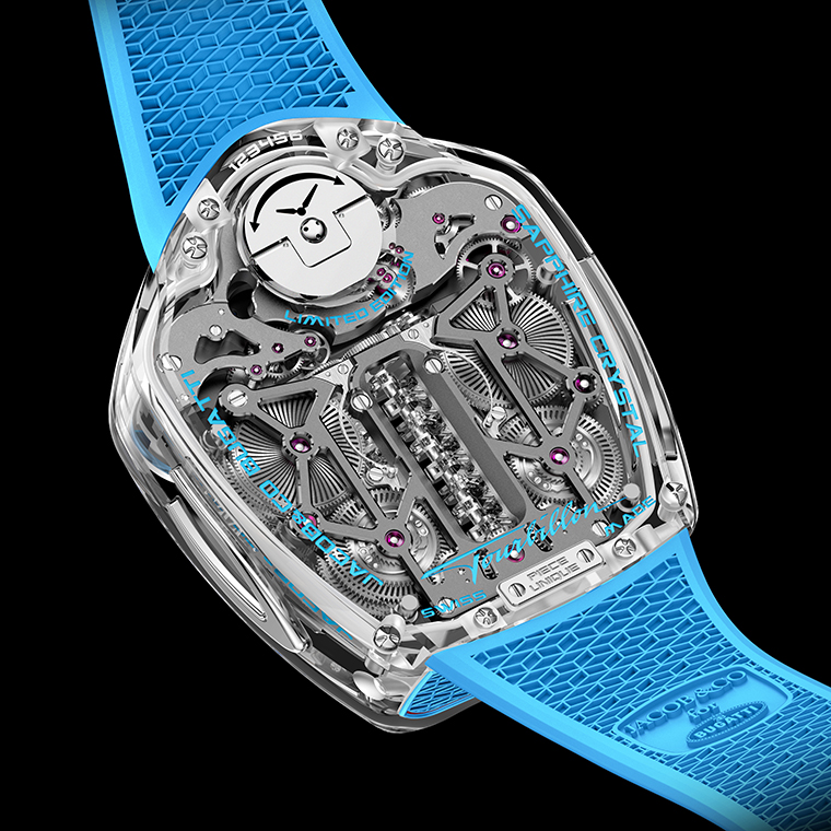 คอลเลกชันเรือนเวลาที่ได้แรงบันดาลใจจากสุดยอดยนตรกรรมไฮเปอร์คาร์ของ Jacob & Co. ได้รับการยกระดับ ไปอีกขั้น ด้วยผลงานใหม่ในวัสดุที่ถือว่าเป็นที่สุดของวงการนาฬิกา ตัวเรือนที่รังสรรค์ขึ้นจากแซฟไฟร์คริสตัลใส ทั้งชิ้น สองปีหลังจากการเปิดตัว Bugatti Tourbillon และหนึ่งปีหลังจาก Bugatti Tourbillon Baguette Jacob & Co. ได้ยกระดับ Bugatti Tourbillon ดั้งเดิมให้เอ็กซ์คลูซีฟไปอีกขั้น ผลงานใหม่ล่าสุดนี้เผย เอกลักษณ์ด้านการ ออกแบบเฉพาะตัวของแบรนด์ ทุกองค์ประกอบล้วนอ้างอิงจากไฮเปอร์คาร์ของ Bugatti รวมถึงกลไกส่วนหุ่นกล ออโตมาตอน (automaton) เครื่องยนต์ V16 ก็ผ่านการออกแบบให้อวดโฉมให้ชมได้อย่างชัดเจนจากทุกมุมมอง