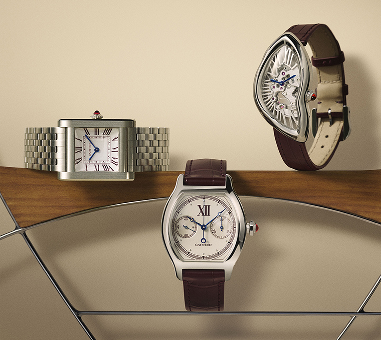 Cartier ตอกย้ำสถานะผู้สร้างสรรค์เรือนเวลาที่ใช้รูปทรงเป็นตัวนำทาง โดยในปีนี้มีการหยิบยกเอาความคลาสสิกมาตีความใหม่ด้วยวัสดุและเทคนิคที่ซับซ้อนยิ่งขึ้น