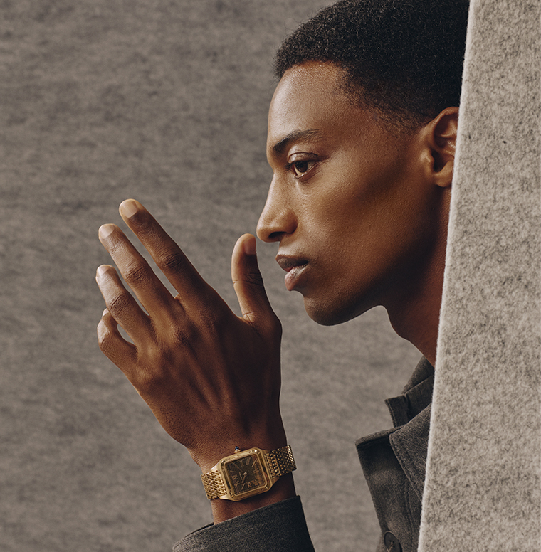 Santos-Dumont: เรือนเวลาที่สะท้อนจิตวิญญาณแบบ Dandyism ได้อย่างชัดเจน ไฮไลต์อยู่ที่หน้าปัดซึ่งทำจาก "หินออบซิเดียนเคลือบทอง" (Gold-coated Obsidian) ที่มีความบางเป็นพิเศษเพียง 0.3 มิลลิเมตร มอบเอกลักษณ์เฉพาะตัวในทุกเรือนด้วยลวดลายตามธรรมชาติของหิน ตัวเรือนมาพร้อมกับสายโลหะสีเยลโลว์โกลด์ที่ถักทออย่างประณีตจากชิ้นส่วนเล็กๆ ถึง 394 ชิ้น มอบสัมผัสที่นุ่มนวลดุจผ้าไหมและรับกับข้อมือได้อย่างสมบูรณ์แบบ