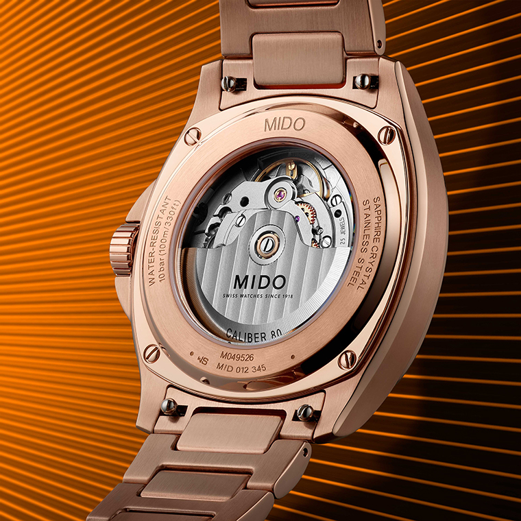 ด้านเข็มชั่วโมงและเข็มนาทีถูกขัดเหลี่ยมเพชรอย่างประณีต พร้อมเคลือบด้วยสารเรืองแสงซูเปอร์มิโนวา (Super-luminova®) สีขาว เพื่อการอ่านค่าที่ชัดเจนแม้ในที่แสงน้อย ควบคู่ไปกับเข็มวินาทีที่ถูกเจียระไนและตัดเหลี่ยมอย่างประณีต ส่วนตัวเรือนด้านข้างติดตั้งเม็ดมะยมแบบขันเกลียว อีกทั้งยังมีระบบล็อกสายบานพับพร้อมปุ่มกด และสลักโลโก้ MIDO ซึ่งมาพร้อมแกนสปริงสำหรับถอดเปลี่ยนสายได้ง่าย ด้านฝาหลังดีไซน์มาแบบโปร่งใสซึ่งเผยให้เห็นความงดงามของกลไกภายในที่ตกแต่งด้วยลวดลาย Côtes de Genève พร้อมสลักโลโก้ MIDO อย่างประณีต ด้านฟังก์ชันขับเคลื่อนด้วยกลไกอัตโนมัติ คาลิเบอร์ 80 (Caliber 80) ที่มอบพลังสำรองยาวนานสูงสุดถึง 80 ชั่วโมง โดดเด่นด้วยบาลานซ์สปริงนิวาครอง (Nivachron™) ซึ่งทนทานต่อสนามแม่เหล็กและการเปลี่ยนแปลงของอุณหภูมิได้อย่างมีประสิทธิภาพ อีกทั้งยังรองรับการกันน้ำลึกถึง 10 บาร์ หรือ 100 เมตร พร้อมครอบด้วยกระจกคริสตัลแซฟไฟร์ที่เคลือบสารกันแสงสะท้อนทั้งด้านในและด้านนอก เพื่อให้สามารถมองเห็นกลไกภายในได้อย่างชัดเจน ทั้งหมดนี้ช่วยเติมเต็มเรือนเวลาที่ผสานความงดงามเชิงดีไซน์เข้ากับความเชี่ยวชาญด้านเทคนิคได้อย่างสมบูรณ์แบบ