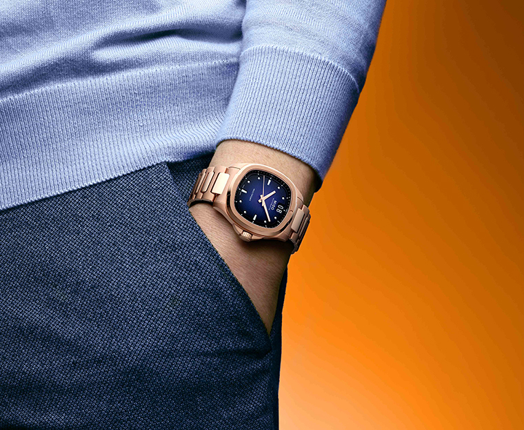 การกลับมาของ มัลติฟอร์ท ทีวี บิ๊กเดท (Multifort TV Big Date) ในครั้งนี้ ถูกถ่ายทอดผ่านภาพจำครั้งใหม่ด้วยสไตล์ที่ดูผ่อนคลายและเป็นธรรมชาติของ อีจงซอก (Lee Jong Suk) ซึ่งผสานเอกลักษณ์ของแบรนด์เข้ากับความร่วมสมัยได้อย่างลงตัว โดยรุ่นนี้มาในตัวเรือนรูปทรงทีวีสุดคลาสสิก ขนาด 40 มิลลิเมตร พร้อมหน้าปัดไล่เฉดจากสีน้ำเงินเข้มสู่สีดำ เพิ่มมิติด้วยลวดลายขัดแนวนอนที่เปล่งประกายเล่นกับแสงได้อย่างงดงาม ตัวเรือนและสายผลิตจากสแตนเลสสตีลขัดซาตินที่เพิ่มความหรูด้วยการขัดเงาบริเวณข้อต่อตรงกลาง พร้อมเคลือบ PVD สีโรสโกลด์อย่างประณีต โดยมีช่องแสดงวันที่ขนาดใหญ่ (Big Date) ที่ตำแหน่ง 12 นาฬิกา ซึ่งเป็นเอกลักษณ์สำคัญของรุ่นนี้ พร้อมด้วยขอบแสดงนาที (Flange) สีขาวที่ช่วยขับรูปทรงหน้าปัดให้โดดเด่นสะกดทุกสายตา เสริมด้วยจุดพ่นทรายที่ช่วยเชื่อมโยงองค์ประกอบดีไซน์ทั้งหมดเข้าไว้ด้วยกันอย่างกลมกลืน