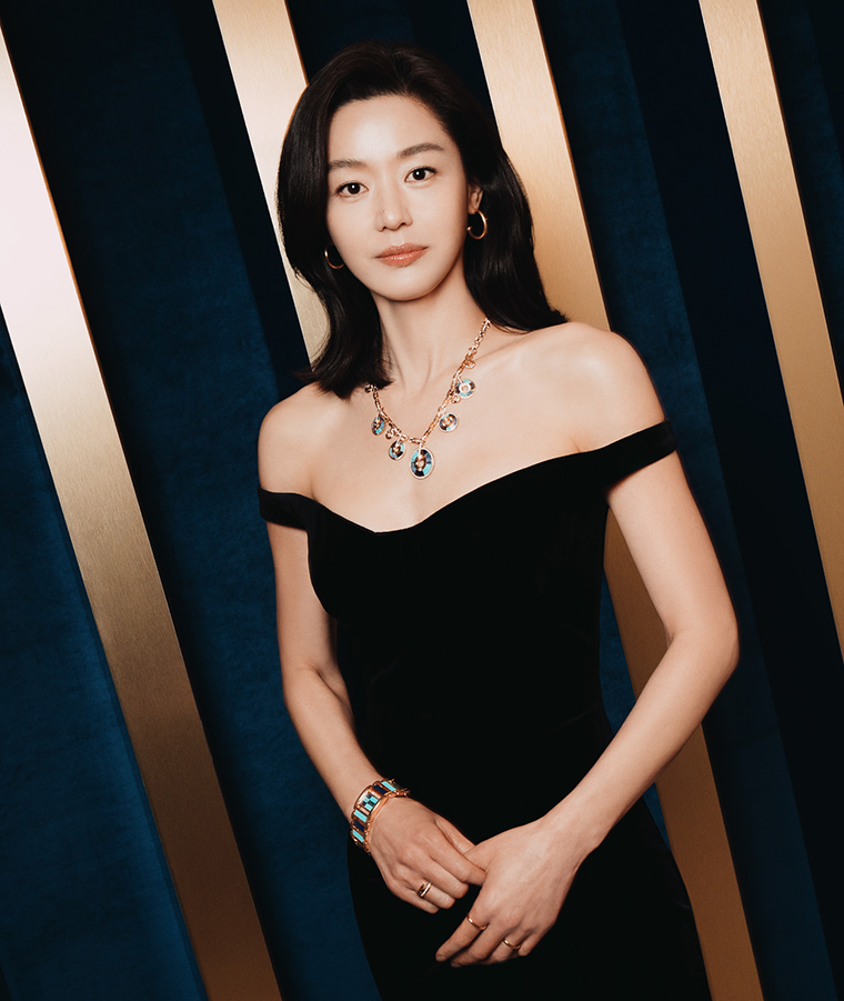 อาโป เลือกสวมเรือนเวลาทรงคุชชั่น อย่าง Andy Warhol ในรุ่น High Jewellery หน้าปัดตกแต่งด้วยหินบรอนไซต์สีน้ำตาล เสริมด้วยเพชรทรงบาแกตต์บนขอบตัวเรือนดีไซน์แบบขั้นบันได แมชต์คู่กับแหวน Andy Warhol ประดับเพชรโทนคอนยัค ขณะที่ เจียนนา จอน ปรากฏตัวพร้อมสร้อยคอ Possession Vibrant Palace จับคู่นาฬิกาทรงกำไล Graphic Illusion watch ที่นำเสนอการรังสรรค์โมเสกหินสีในเฉดสีน้ำเงินผสมผสานกับเทคนิคช่างทองอันเป็นเอกลักษณ์ของเมซงได้อย่างไร้ที่ติ