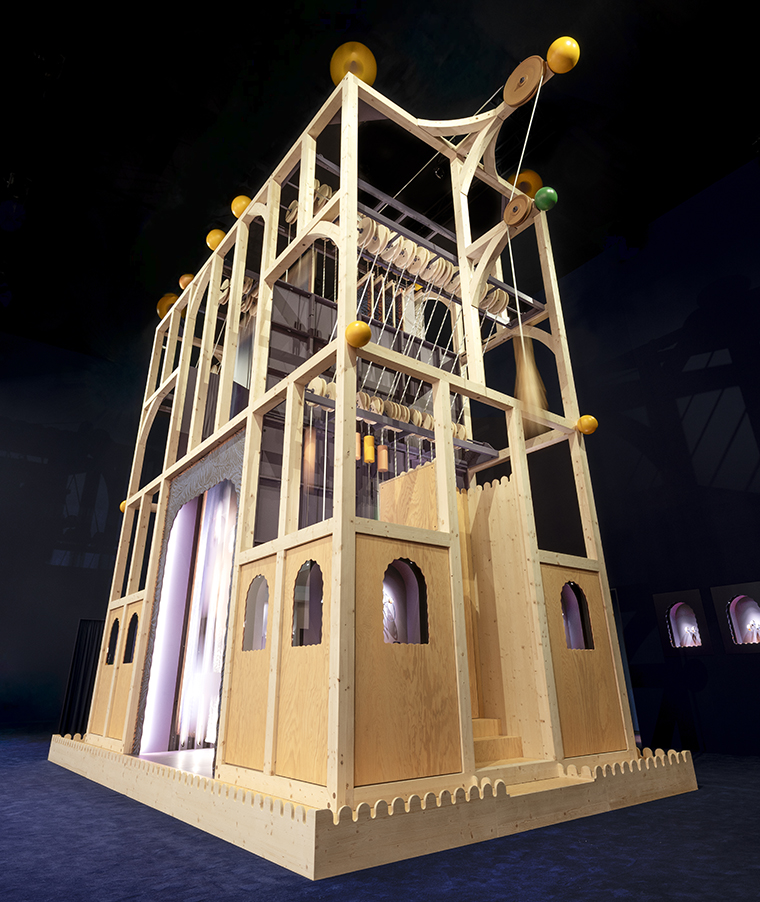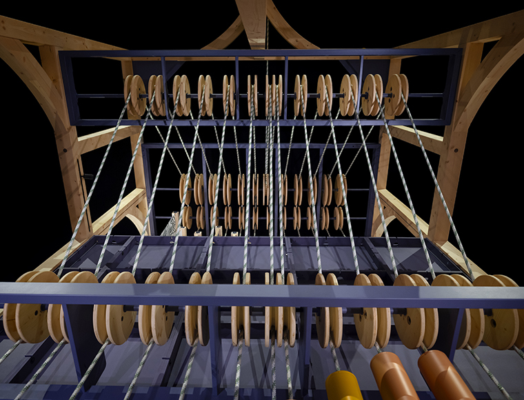 การเคลื่อนไหวปรากฏให้เห็นทั่วทุกจุด ด้วยรอกขึงเชือกจำนวนมากที่ร่วมกันดึงขึ้น และทิ้งตัวลง ก่อเสียงขัดสีระหว่างลูกล้อ ทั้งคานถ่วง และตุ้มถ่วงต่างดำเนินจังหวะการทำงานของตนอย่างไม่หยุดหย่อนจนทั่วทุกมุมแทบปราศจากการหยุดยั้งเช่นโครงสร้างจักรกลขนาดมหึมา
