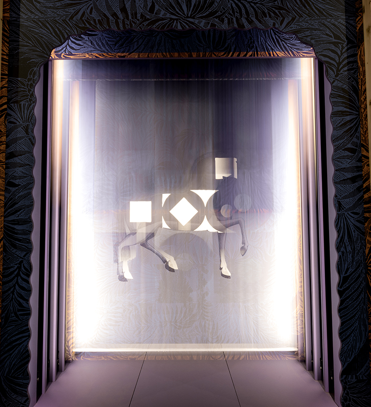 ขณะเดียวกัน ตรงช่องว่างกลางโครงสร้าง ภายในกรอบประตูด้านหน้าคือมิติทรงเงาร่างม้าผูกเครื่องวิ่งปรากฏท่วงท่าเคลื่อนไหวอย่างต่อเนื่อง ด้วยการใช้หลากรูปทรงเรขาคณิต กีบเท้า, ดวงตา และขาสะท้อนถึงงานสลักลายฉลุที่จานเปาโล ปาญิฝากฝีมือสรรค์สร้างไว้กับนาฬิกาข้อมือ Arceau Cavalier (อารโซ กาวาลิเอร) รุ่นก่อน