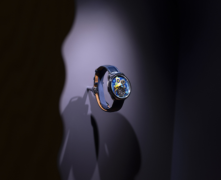 รายรอบด้านโครงสร้างสถาปัตยกรรมเรือนไม้ คือช่องจัดแสดงผลงานเครื่องบอกเวลาด้วยการติดตั้งไว้ชิดผนัง เสมือนเป็น “โรงละคร” ย่อส่วนให้รับชมนาฬิกาข้อมือรุ่นใหม่ได้อย่างชัดเจนรวมถึง Hermès H08 Squelette และ Arceau Samarcande