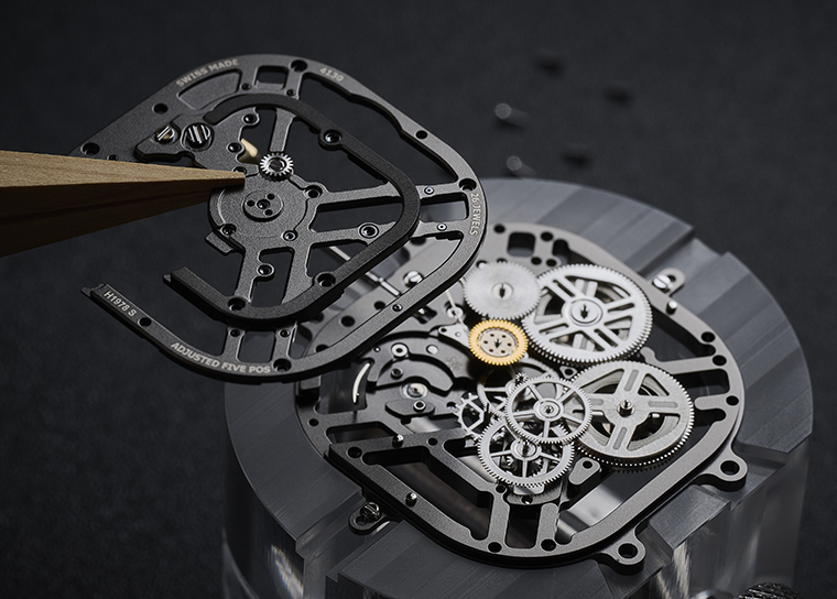 ทุกครั้งที่ก้มลงดูเวลา สายตาไม่อาจละไปจากความสลับซับซ้อนของบรรดากลไกซึ่งถูกจัดระเบียบอย่างเป็นระบบโดยปราศจากความแออัด มอบผลลัพธ์ราวกับประติมากรรมสรรค์สร้างจากลายเส้นกับฟันเฟืองเคลือบเงารายล้อม Hermès H1978 S จักรกลรุ่นใหม่ หัวใจสำคัญของระบบขับเคลื่อนด้วยงานเชื่อมต่อ และเหลื่อมซ้อนชิ้นส่วนโลหะไททาเนียมขึ้นโครงอย่างประณีต หมดจด